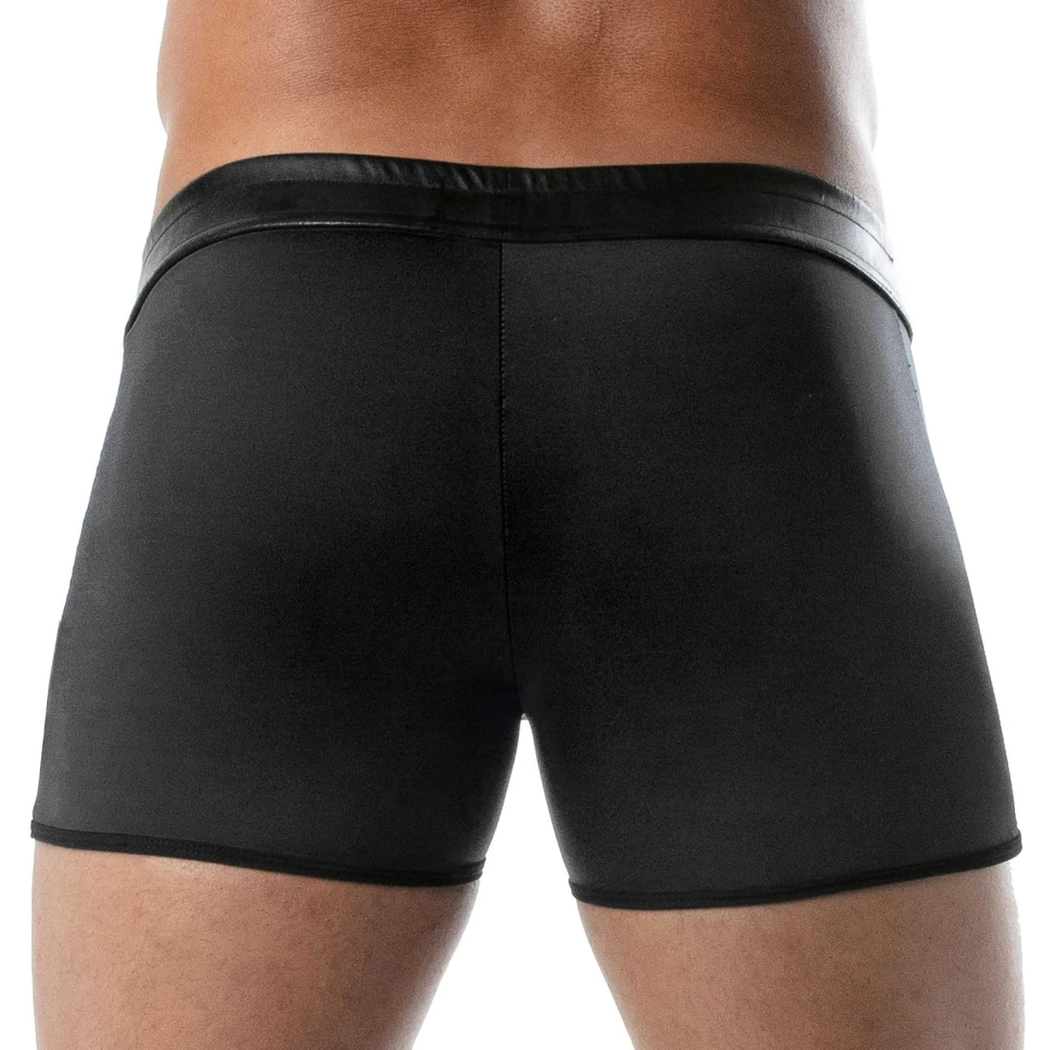 Short fetish moulant en microfibre extensible, confortable et légère. Poche frontale et ceinture en simili cuir. Bande verticale sur la poche frontale pour mettre en valeur votre masculinité. Logo TOF en silicone cousu sur la ceinture élastique. Fabrication française.