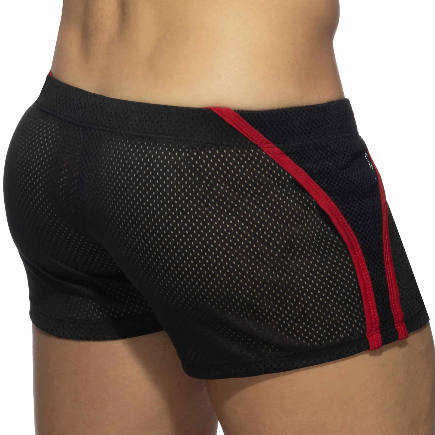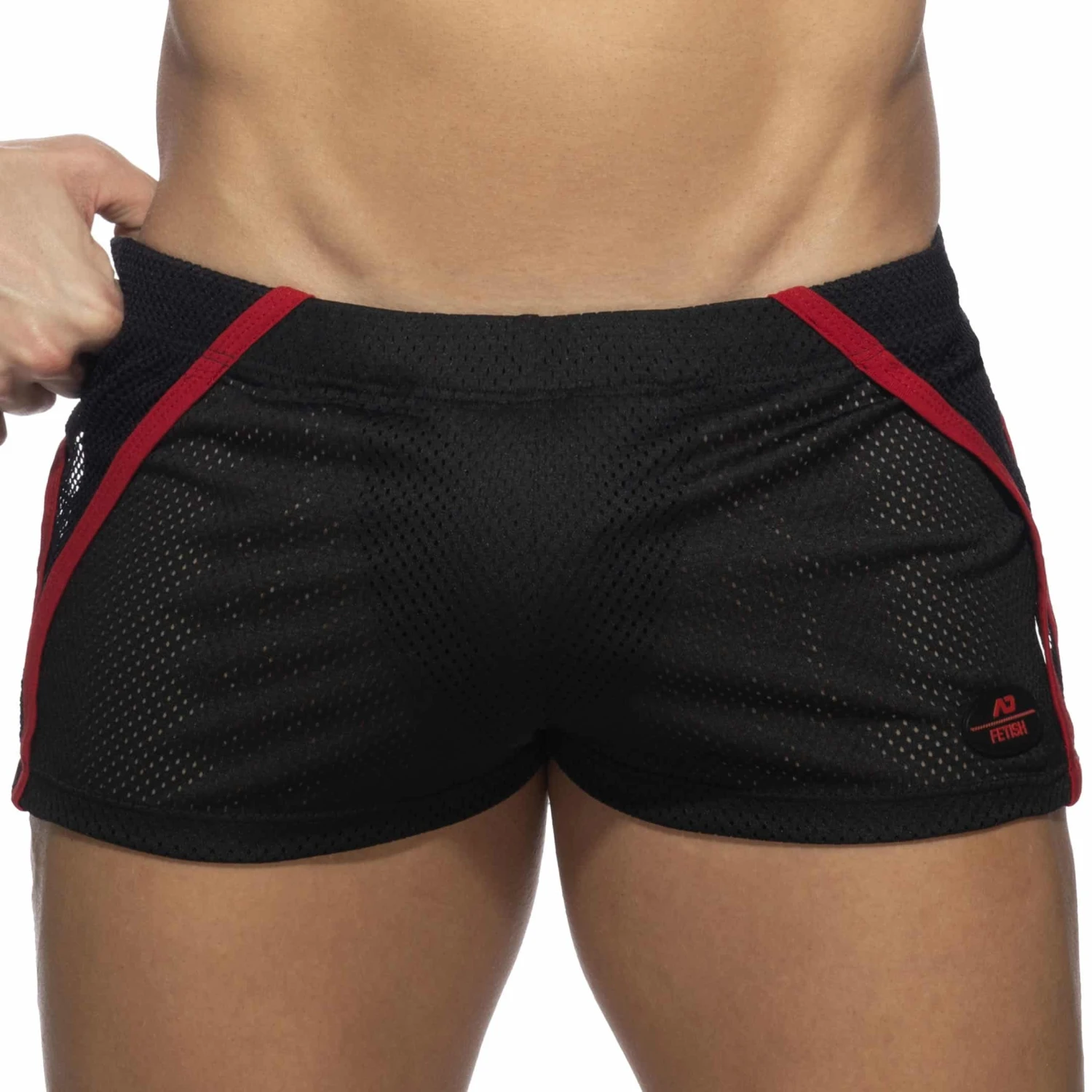 Short sexy en mesh perforé très doux et confortable. Couche superposée en résille ouverte sur les côtés. Poche intérieure Kango pour un grand confort fronta. Ceinture élastique recouverte avec cordon de serrage intérieur. Logo AD Fetish en silicone sur la cuisse gauche.