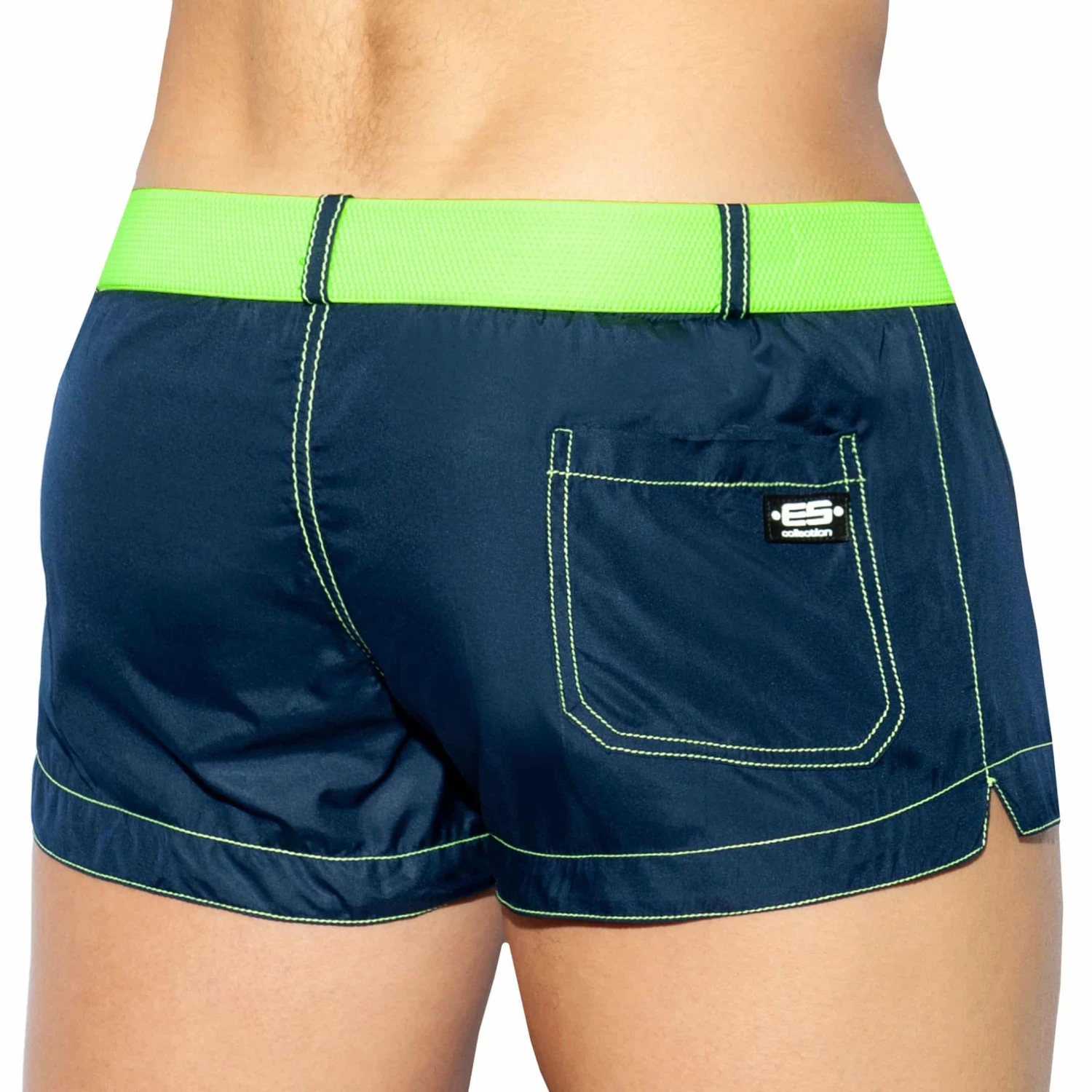 Short de bain court en polyester ultra léger séchant rapidement. Coupe taille basse, sexy et ajustée. Slip intérieur U-Shape en mesh pour un grand confort. Poche arrière. Ceinture de couleur contrastée avec clip fonctionnel.