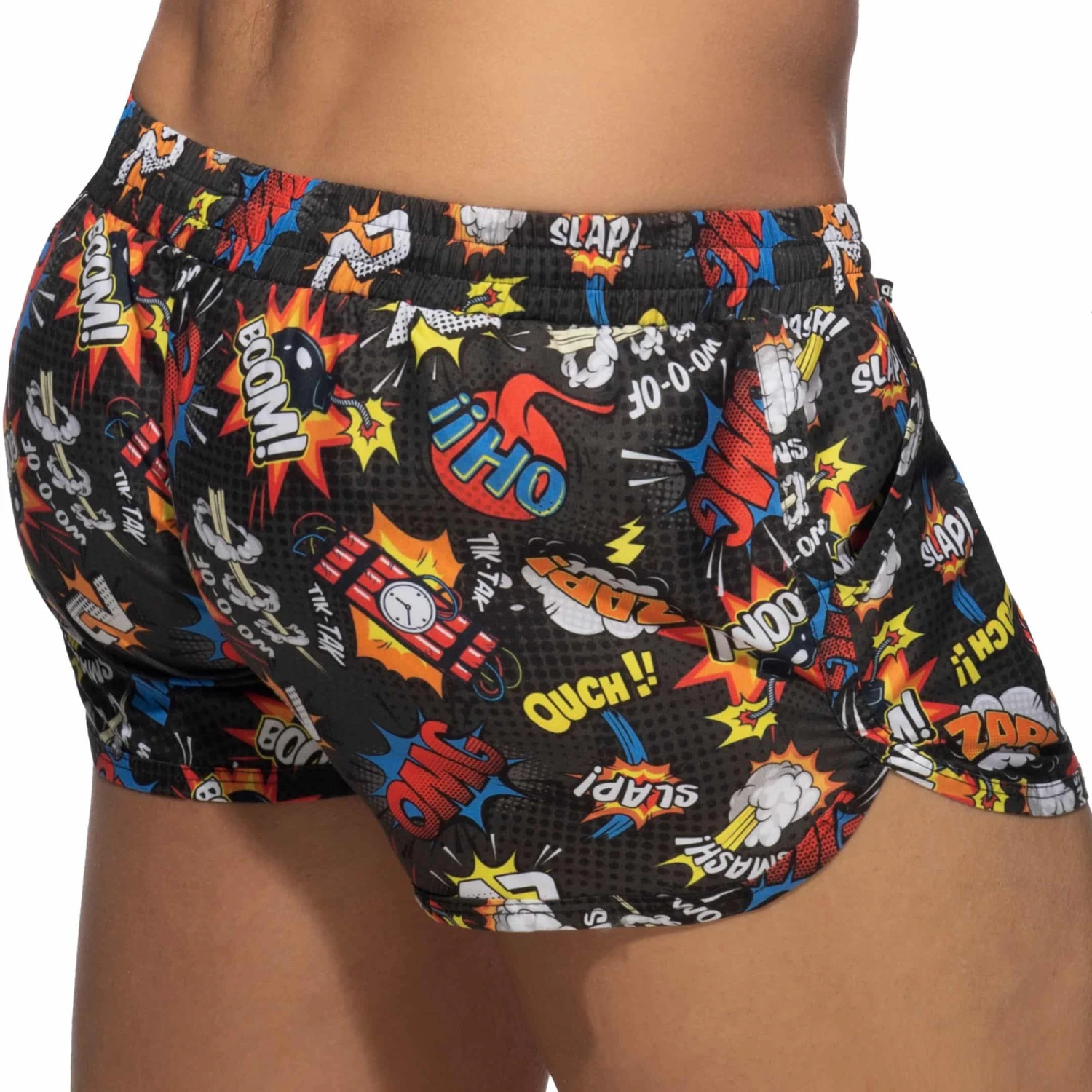 Short de bain taille basse en microfibre imprimée d’un motif cartoon original et coloré. 2 poches sur les côtés. Slip intérieur U-Shape en mesh pour un grand confort. Ceinture élastique avec cordon de serrage.
