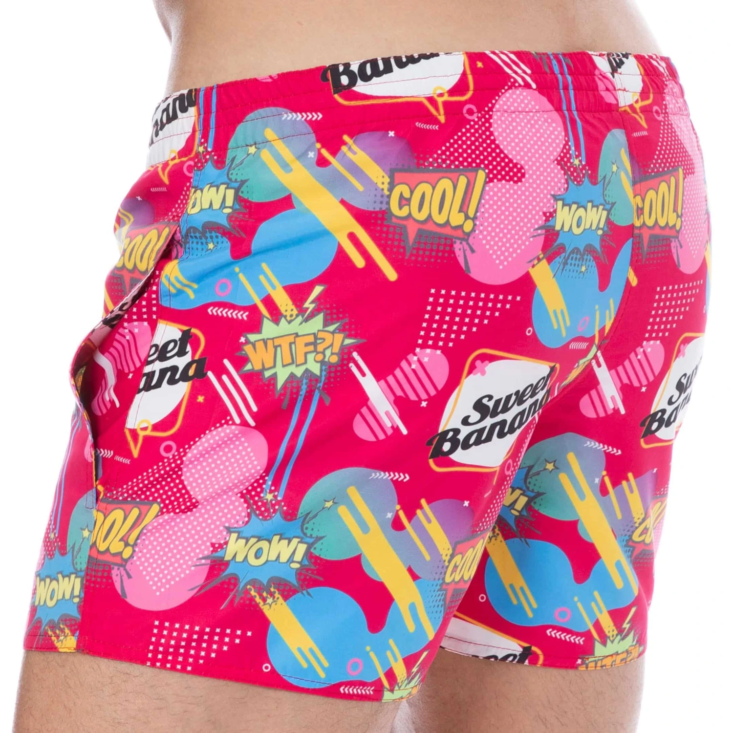 Short de bain très sexy en microfibre résistante, séchant rapidement. Imprimé cartoon très tendance. Coupe taille basse et très ajustée. 2 poches. Slip intérieur en résille. Ceinture élastique avec cordon de serrage intérieur. Fabrication 100% italienne.