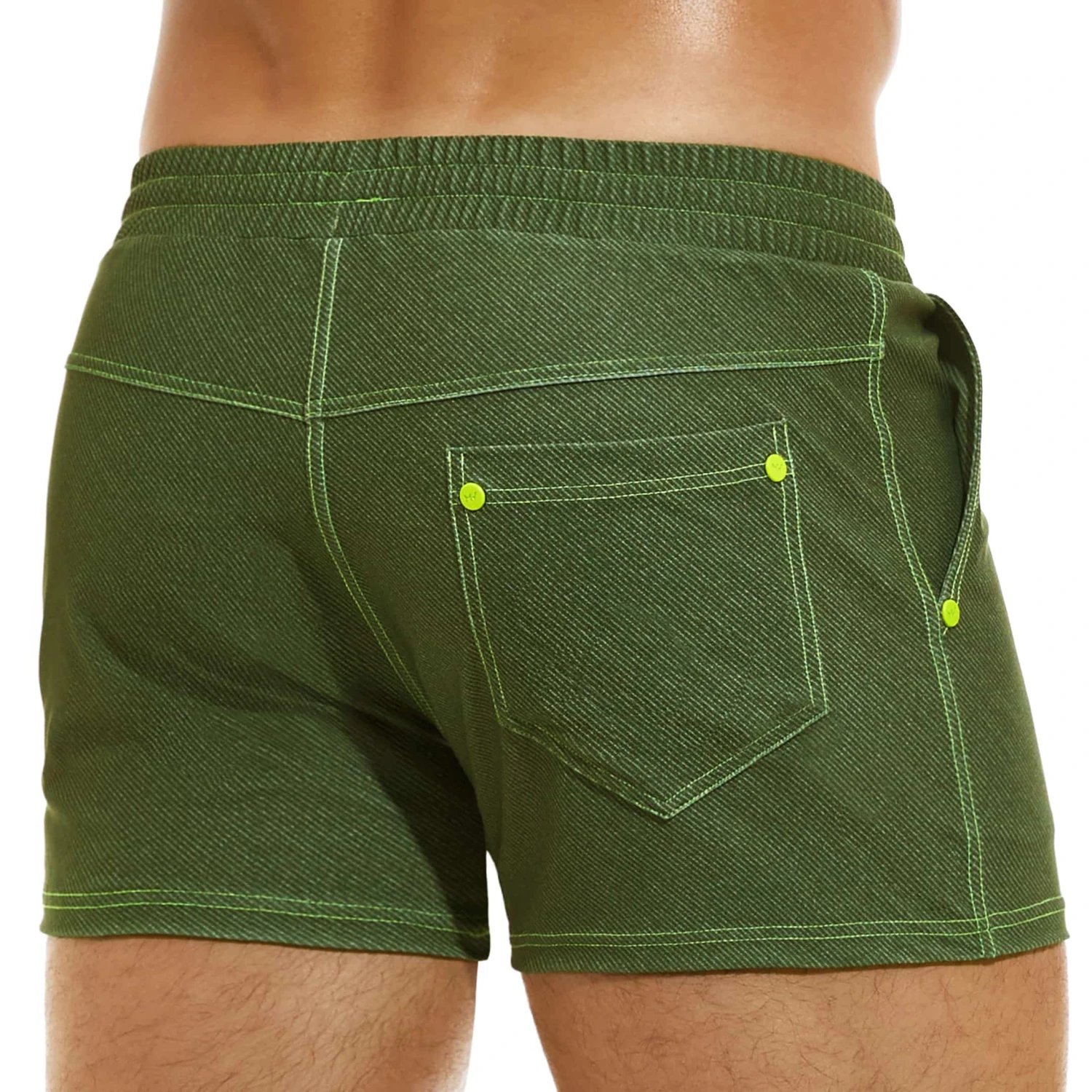 Short de bain en microfibre douce séchant rapidement. Imprimé et coutures imitant le jeans. Boutons métalliques décoratifs. 3 poches. Braguette factice. Slip intérieur. Ceinture élastique avec cordon de serrage. Logo MV en silicone sur la jambe gauche.