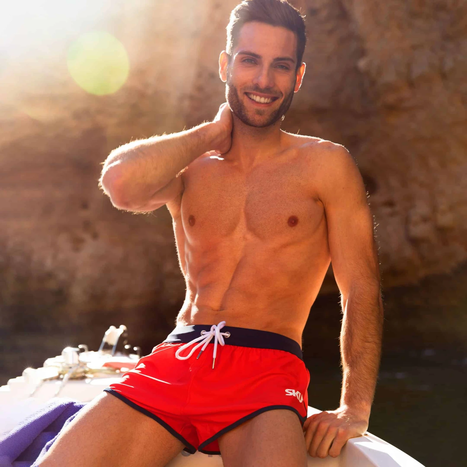 Short de bain sport en microfibre séchant rapidement. Bordures de couleur contrastée. Slip intérieur en mesh fin pour un grand confort. Logo SKU imprimé sur la cuisse gauche. Ceinture élastique avec cordon de serrage.