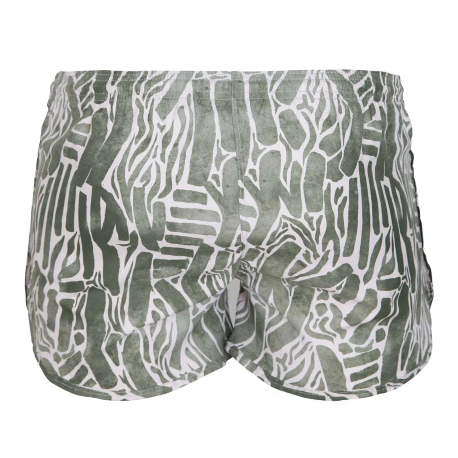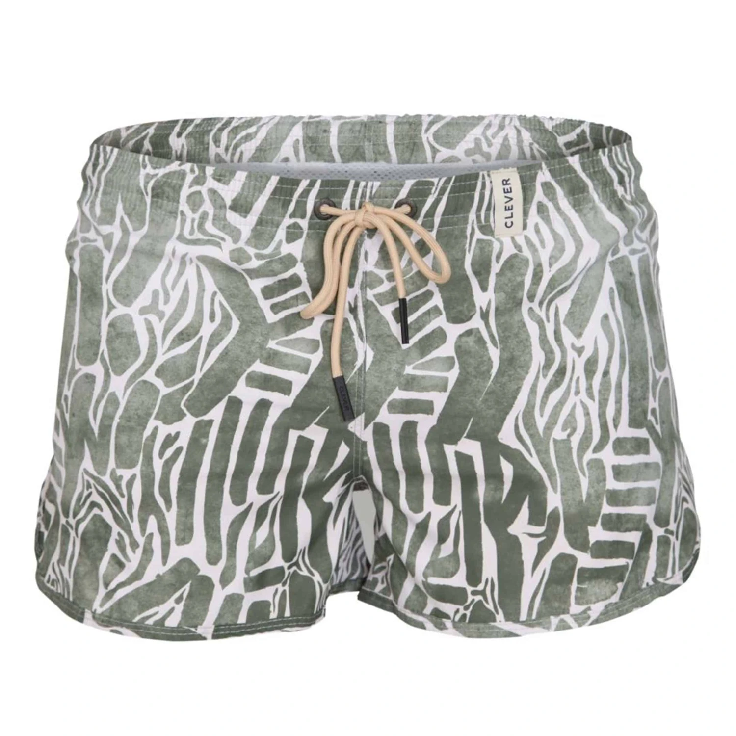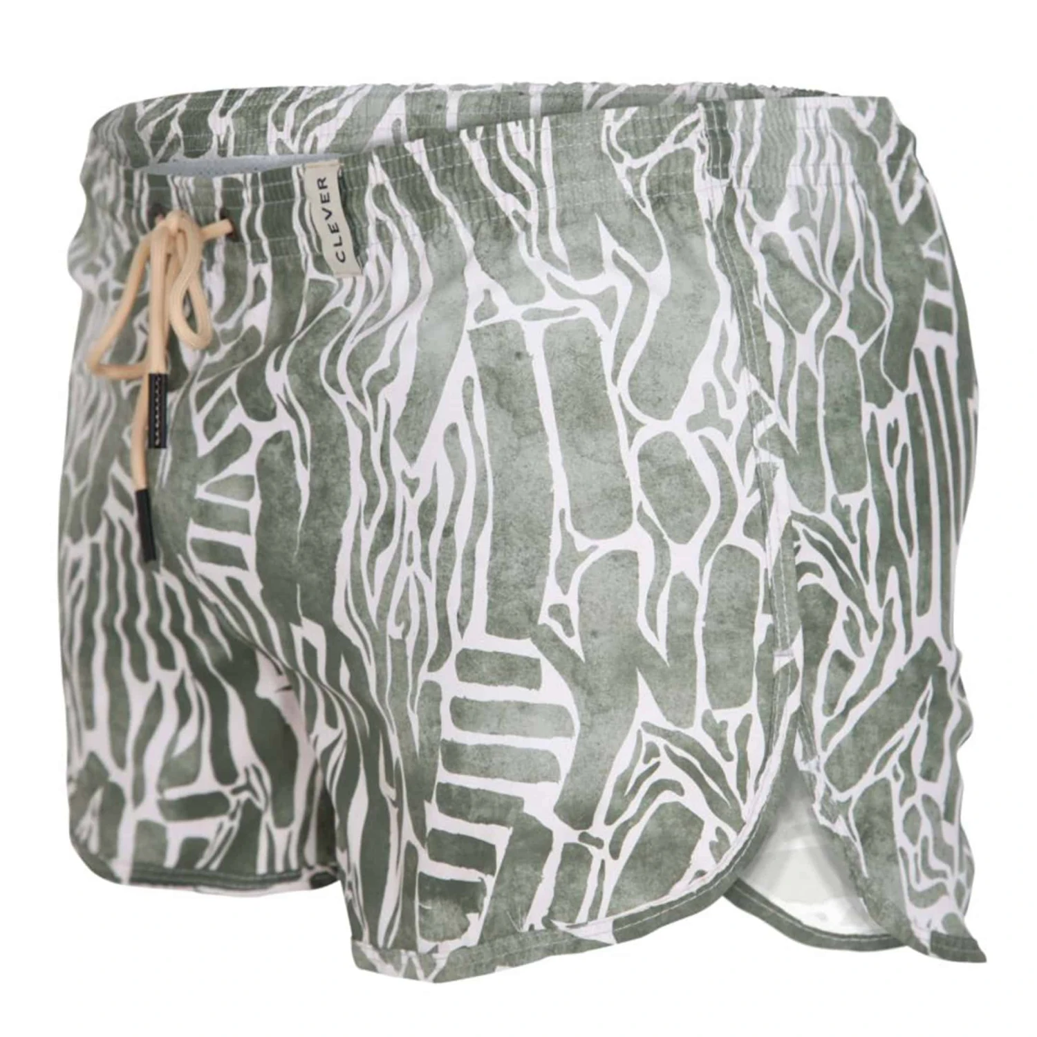 Short de bain taille basse en microfibre douce et confortable. Imprimé géométrique abstrait. 2 poches. Ceinture élastique avec cordon de serrage.