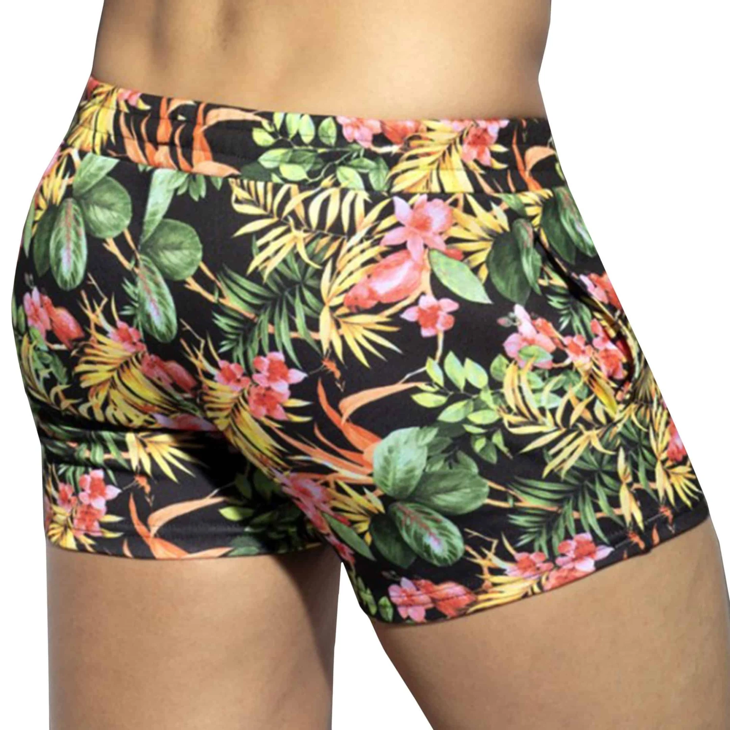 Short doux et confortable en microfibre imprimée d’un motif hawaïen. Deux poches sur les côtés. Ceinture élastique avec cordon de serrage contrasté. Logo ES Collection en silicone sur la jambe gauche.