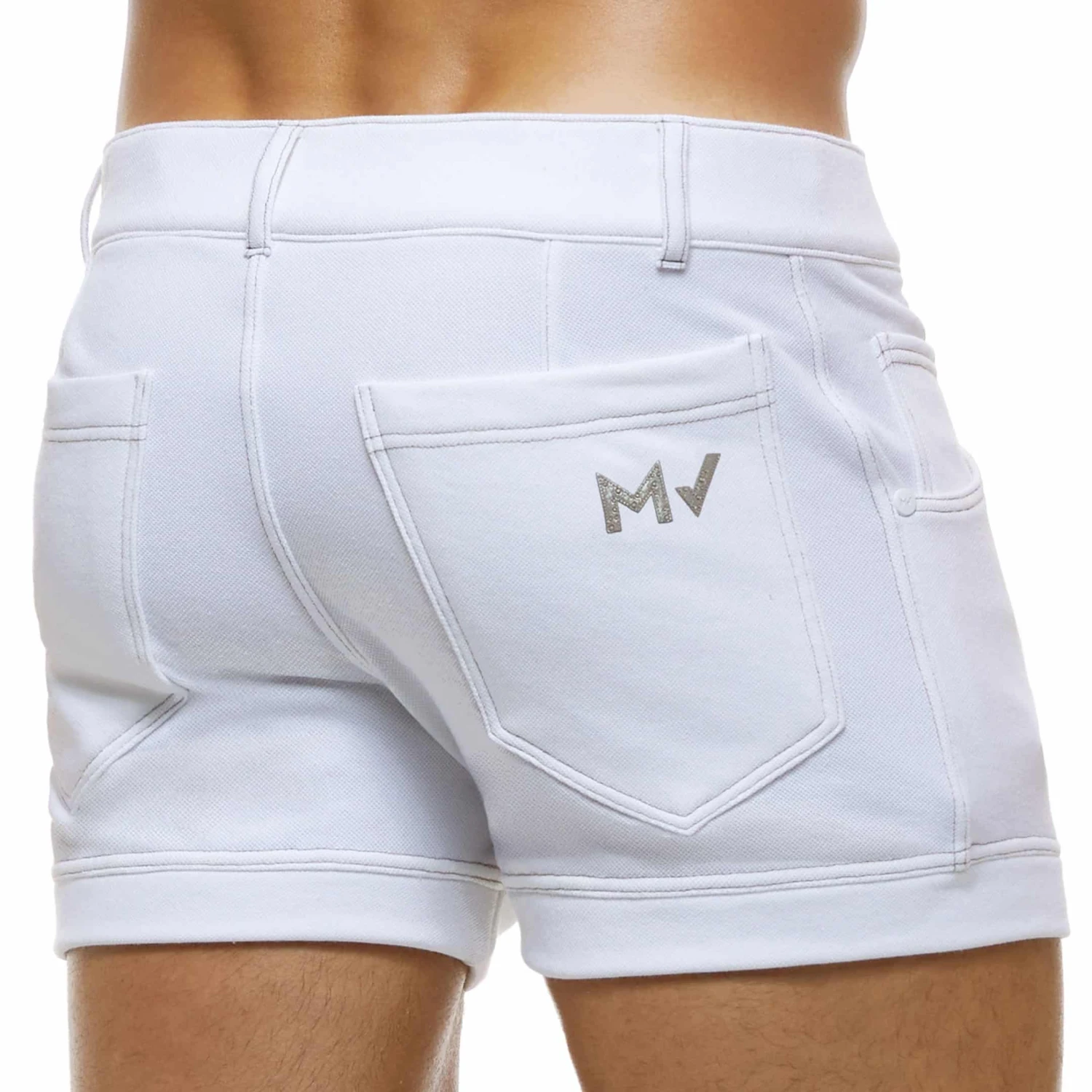 Short en mélange de viscose et de microfibre imitant le jeans. Coupe taille basse, sexy et très ajustée. 3 poches à l’avant et 2 poches à l’arrière. Braguette à fermeture Eclair et 1 bouton. Passants de ceinture. Logo MV sur la poche arrière droite. Rivets métalliques.