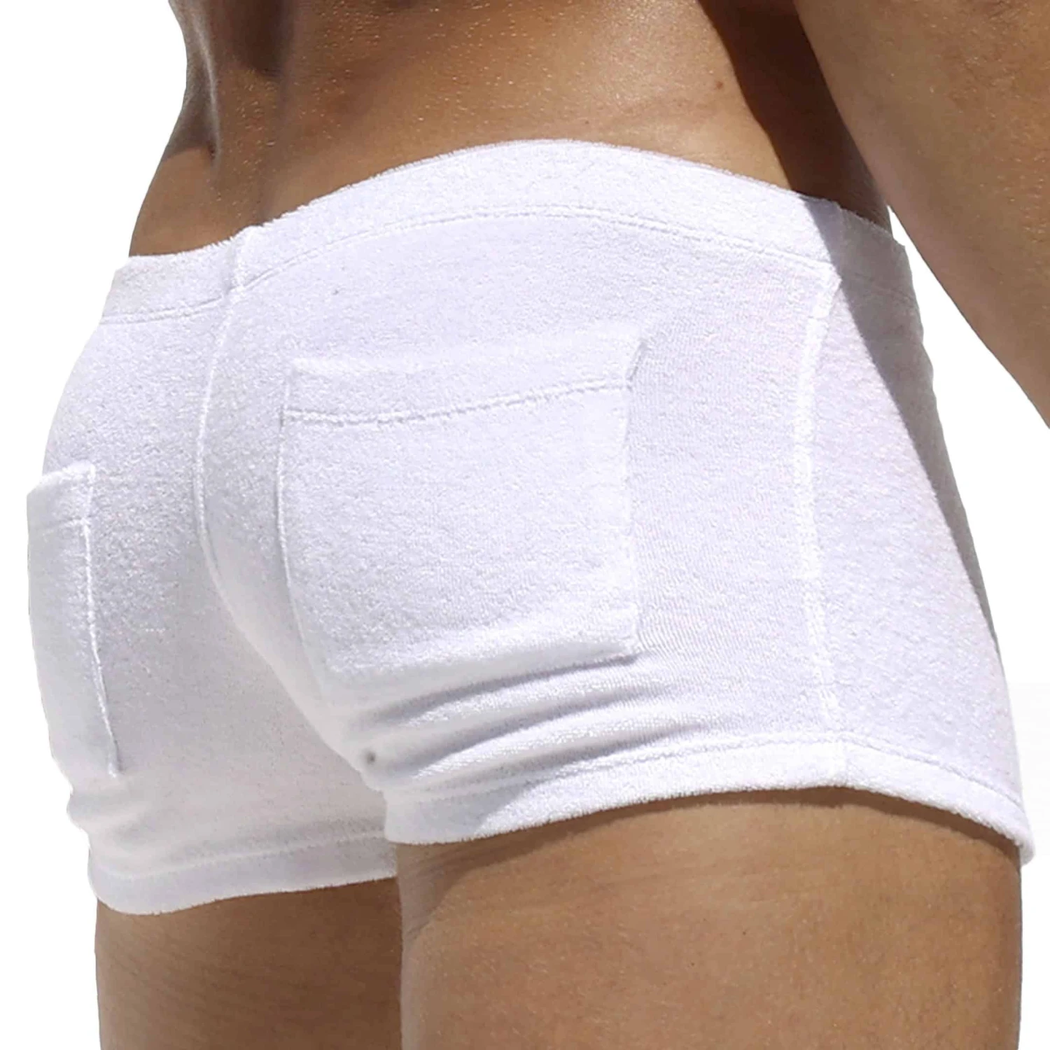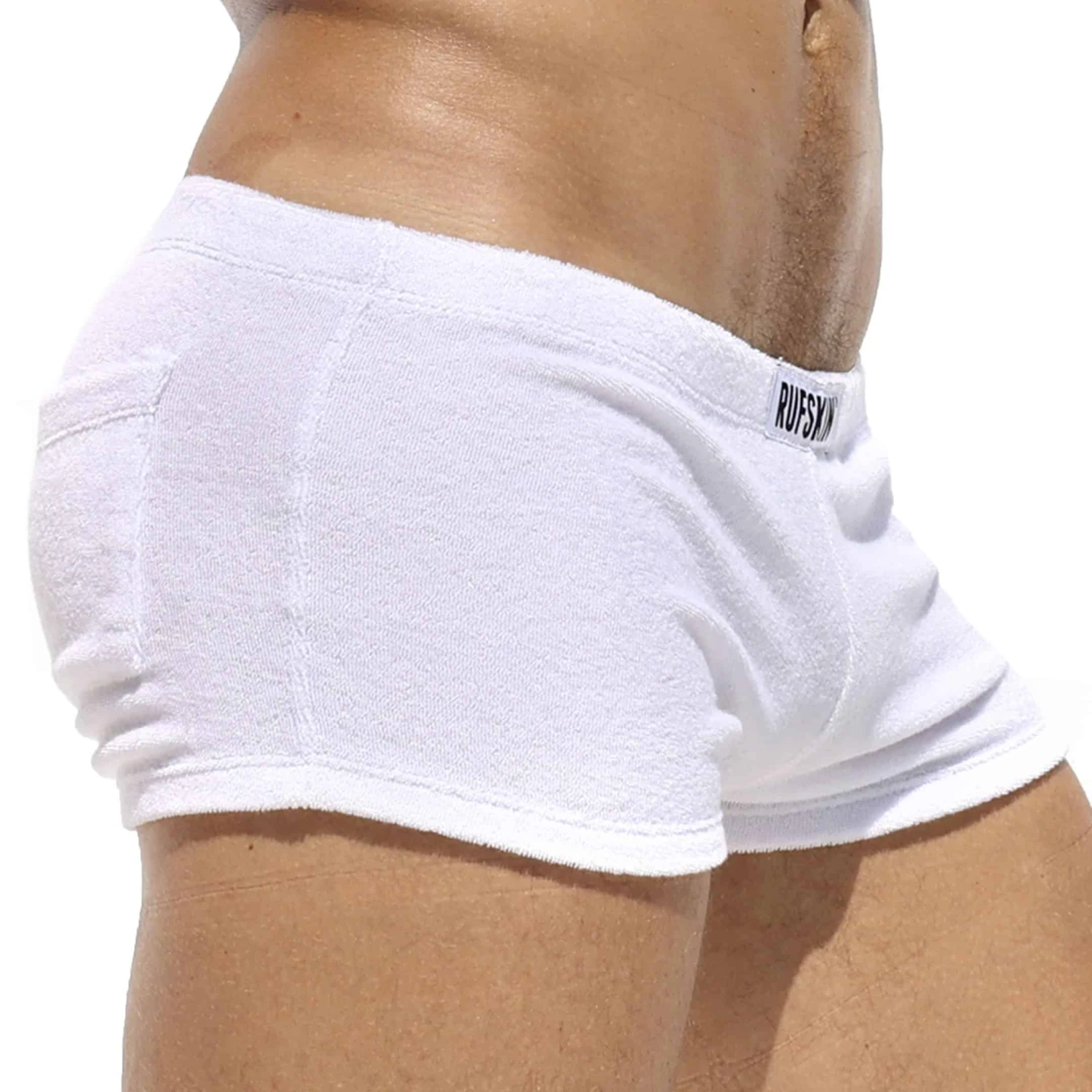 Short en coton éponge super doux et confortable. Coupe courte et très moulante. Etiquette Rufskin cousue sur la ceinture élastique recouverte. 2 poches à l’arrière. Braguette factice. Fabriqué en Californie.