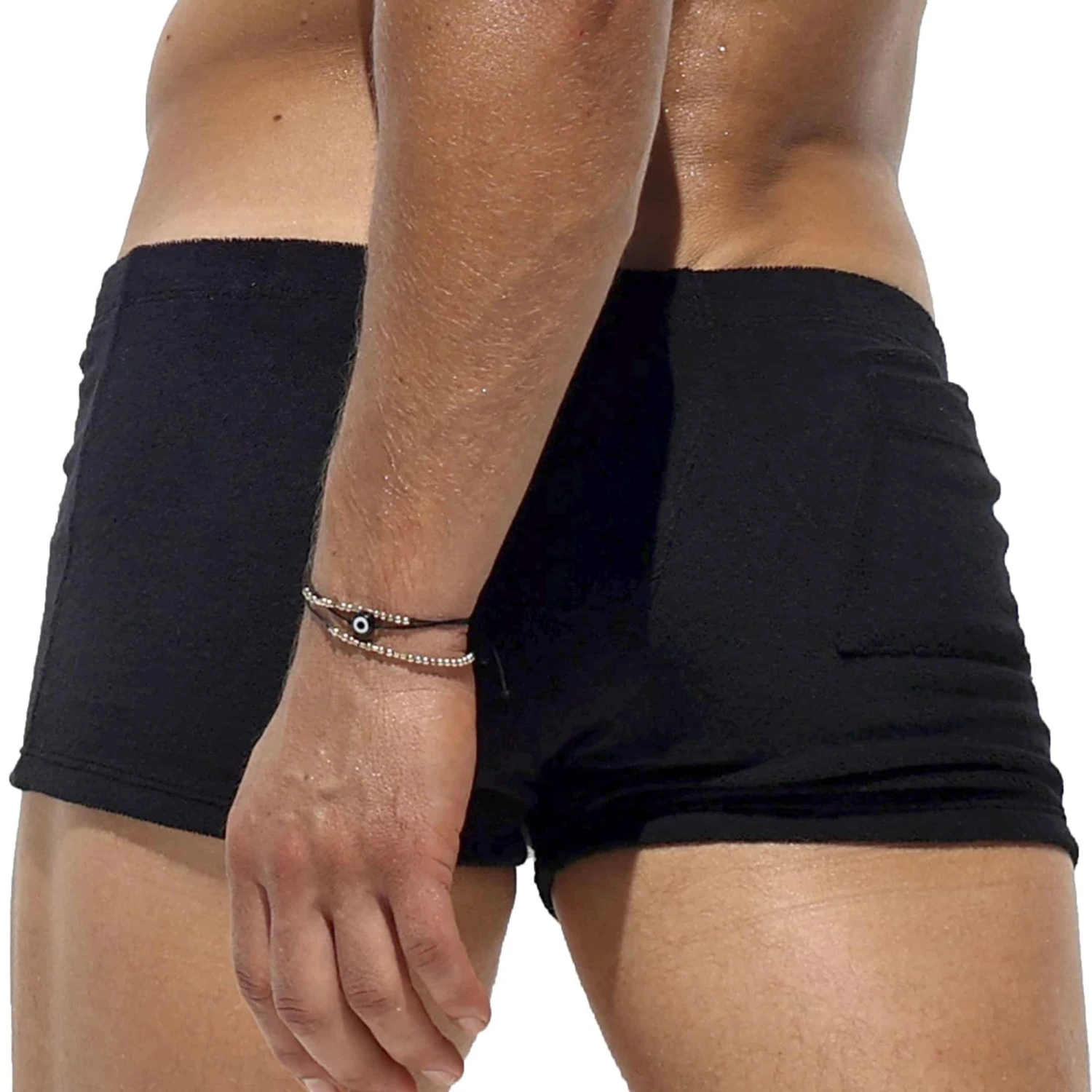 Short en coton éponge super doux et confortable. Coupe courte et très moulante. Etiquette Rufskin cousue sur la ceinture élastique recouverte. 2 poches à l’arrière. Braguette factice. Fabriqué en Californie.