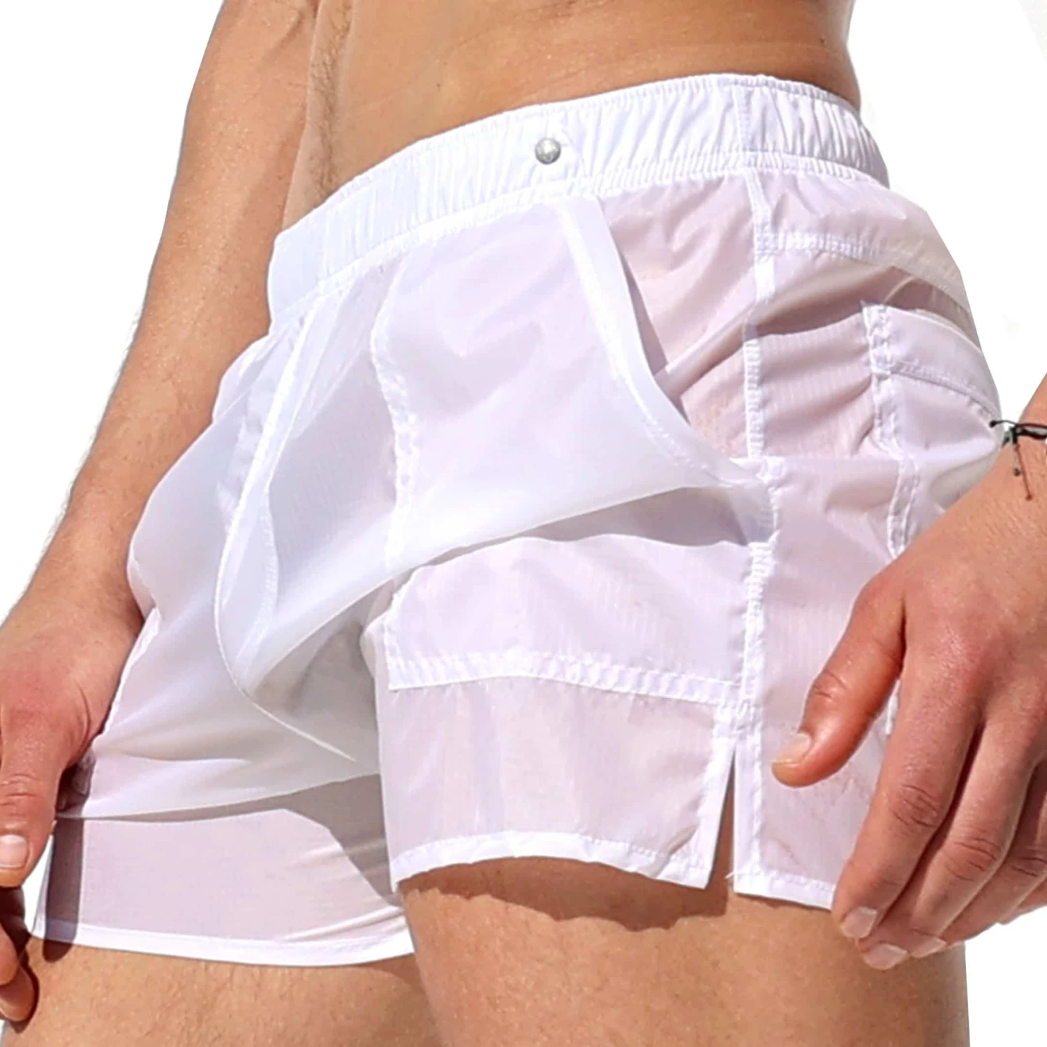 Short fabriqué en nylon transparent rip-stop pour une durabilité renforcée. A porter par-dessus un maillot de bain ou sans rien dessous ! Coupe courte et échancrée sur le côté. 4 poches. Braguette factice. Rivet métallique. Ceinture élastique recouverte. Etiquette Rufskin à l’arrière. Fabriqué en Californie.