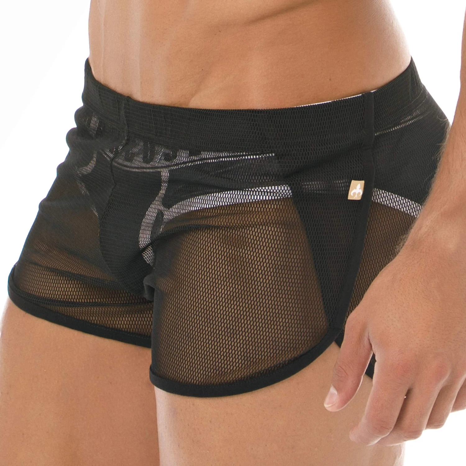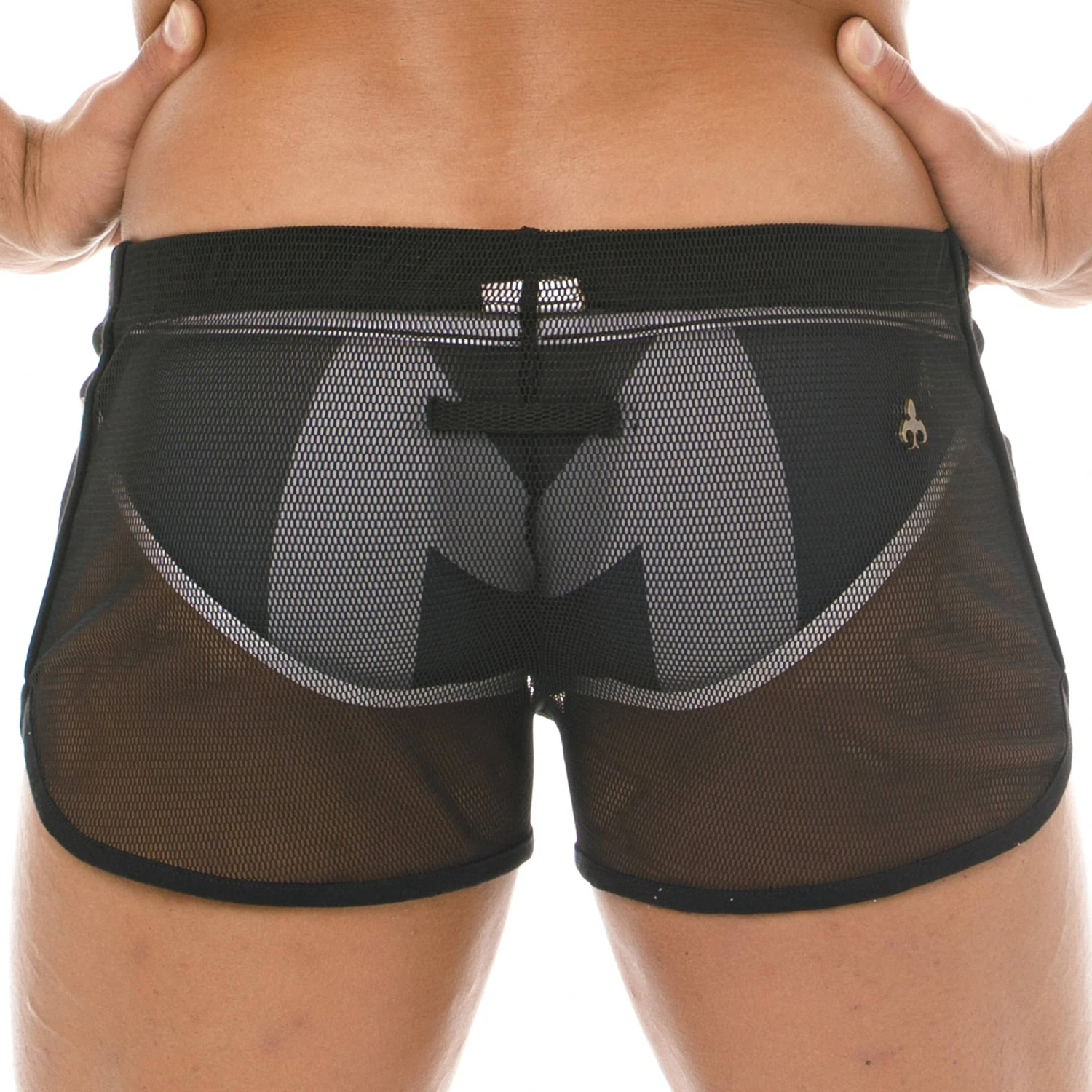 Short sport et sexy en mesh ajouré et totalement transparent. Coupe échancrée sur le côté. Non doublé. Ceinture élastique à la taille. Logo Marcuse en métal sur la fesse droite. Slip vendu séparément.