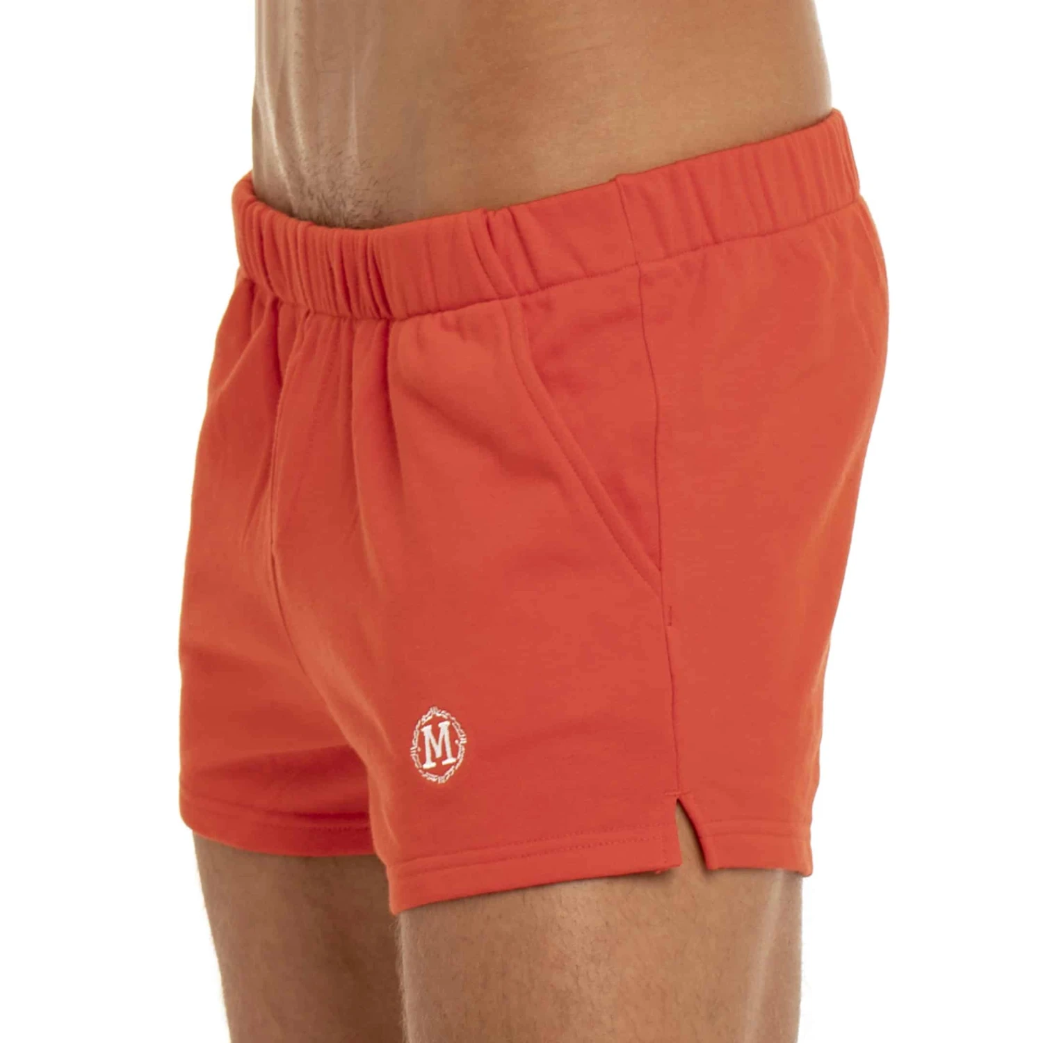 Short sport en pur coton doux et confortable. Coupe taille basse ajustée. 2 poches sur les côtés et 1 poche à l’arrière. Logo Marcuse brodé sur la cuisse gauche. Ceinture élastique recouverte.