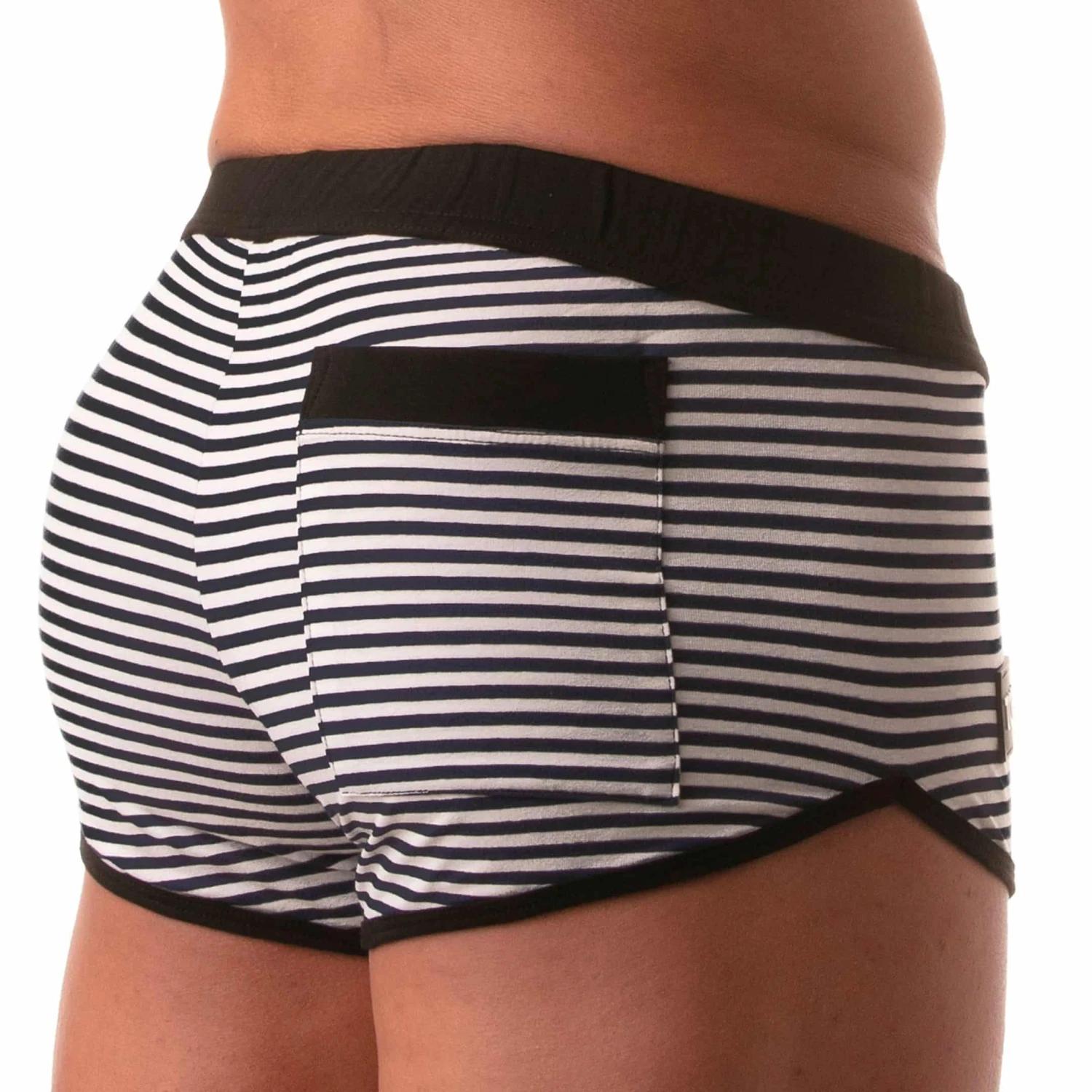 Short taille basse en coton stretch imprimé d’une élégante rayure façon marinière. Superbe coupe incurvée sans couture sur les côtés, pour un grand confort et de belles fesses rondes. Braguette factice. Poche arrière. Ceinture élastique. Logo TOF en silicone sur la cuisse droite. Fabrication française.