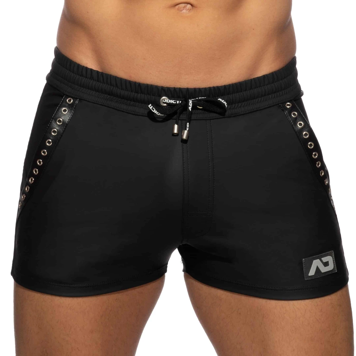 Short taille basse très ajusté en microfibre imitant le néoprène, pour un look très fetish. Bandes en simili cuir ornées d’œillets métalliques sur les poches. Logo AD en silicone sur la cuisse gauche. Ceinture élastique avec cordon de serrage.