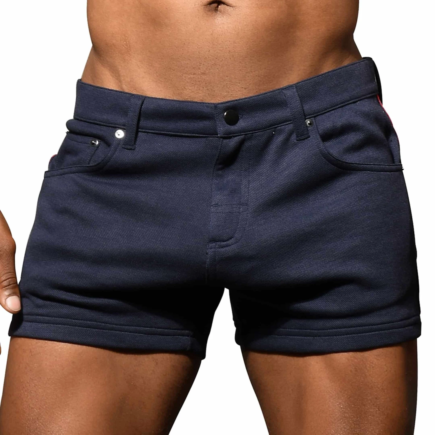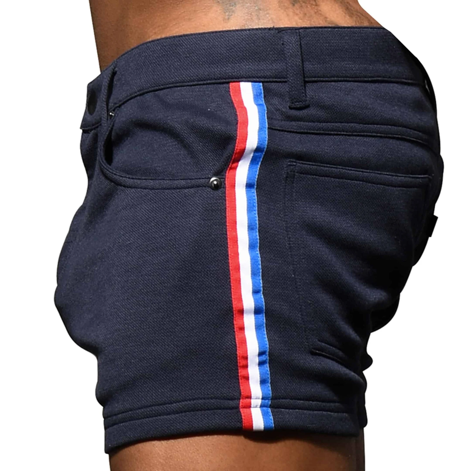 Short en mélange extensible et respirant de coton et de microfibre imitant le jeans. Coupe skinny, taille basse, et très sexy. 5 poches. Braguette à fermeture Eclair et 1 bouton. Passants de ceinture. Bande tricolore sur les côtés. Rivets métalliques. Taille US. Edition Limitée.