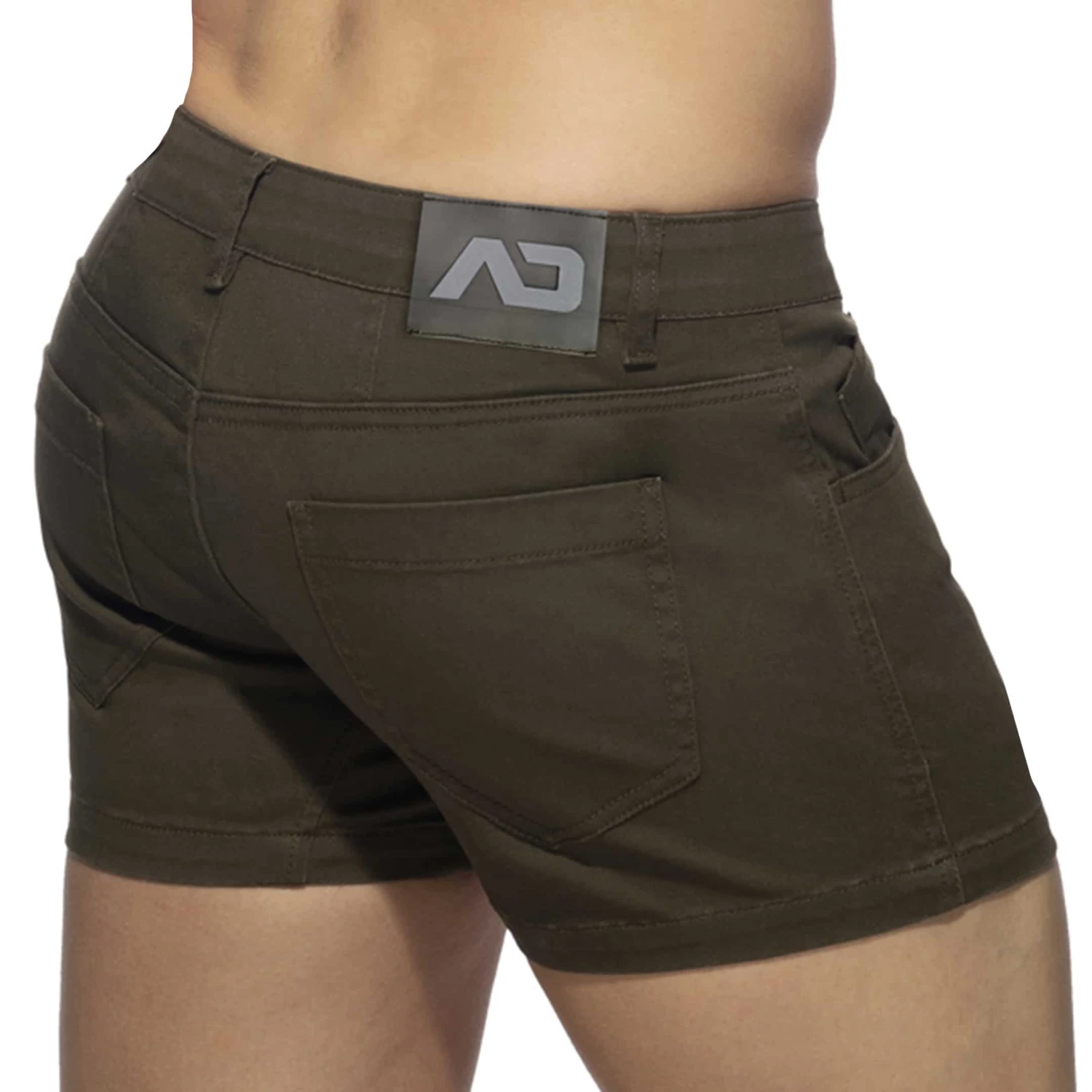 Short court en coton stretch, doux léger et respirant, parfait pour l’été. 5 poches. Passants de ceinture. Coutures style jean. Braguette à bouton et fermeture Eclair. Grand logo AD en silicone à l’arrière.