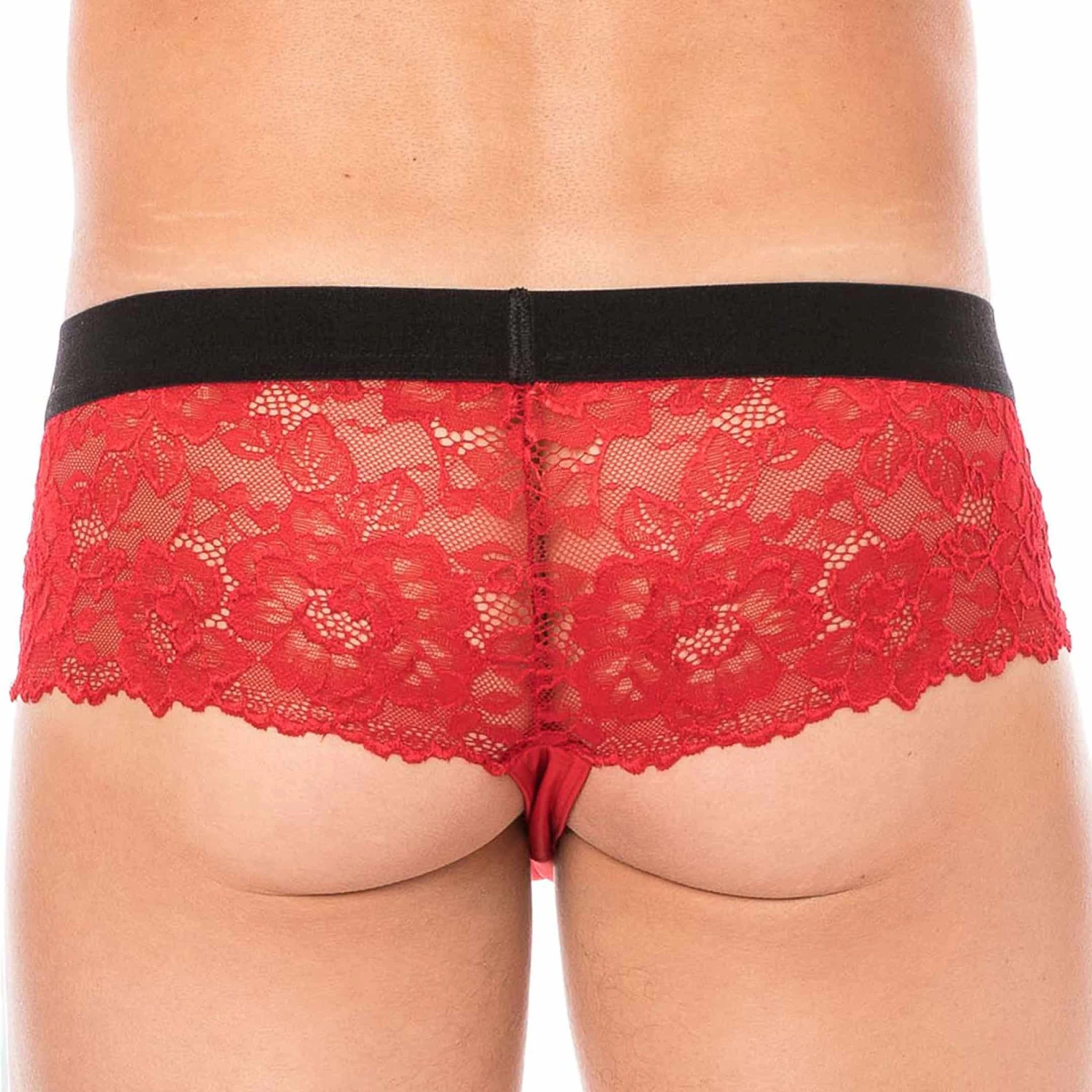 Shorty ultra sexy en dentelle fine, délicate et transparente, ornée d’un motif floral. Poche frontale en microfibre opaque, non doublée. Coupe ajustée et très échancrée sur les fesses. Large ceinture élastique signée Lookme.