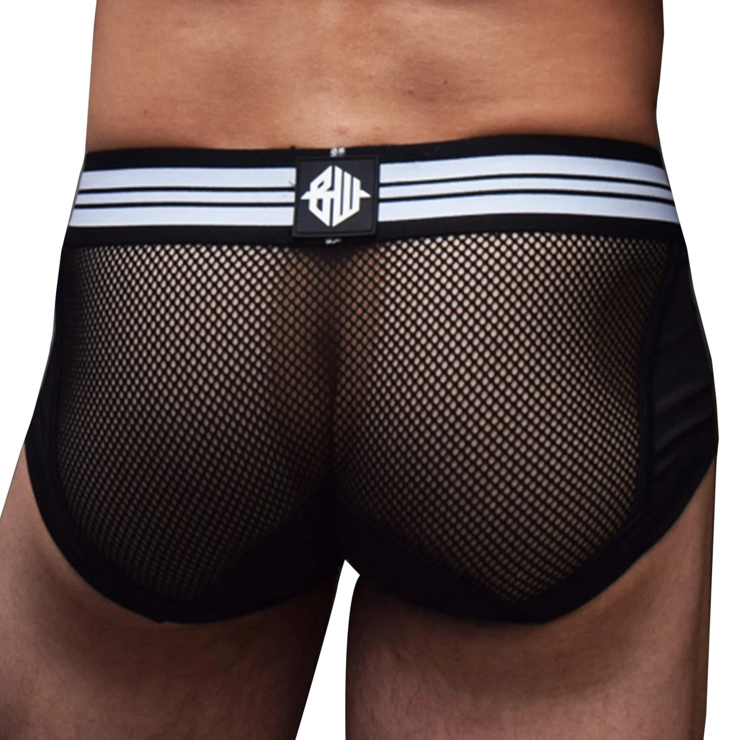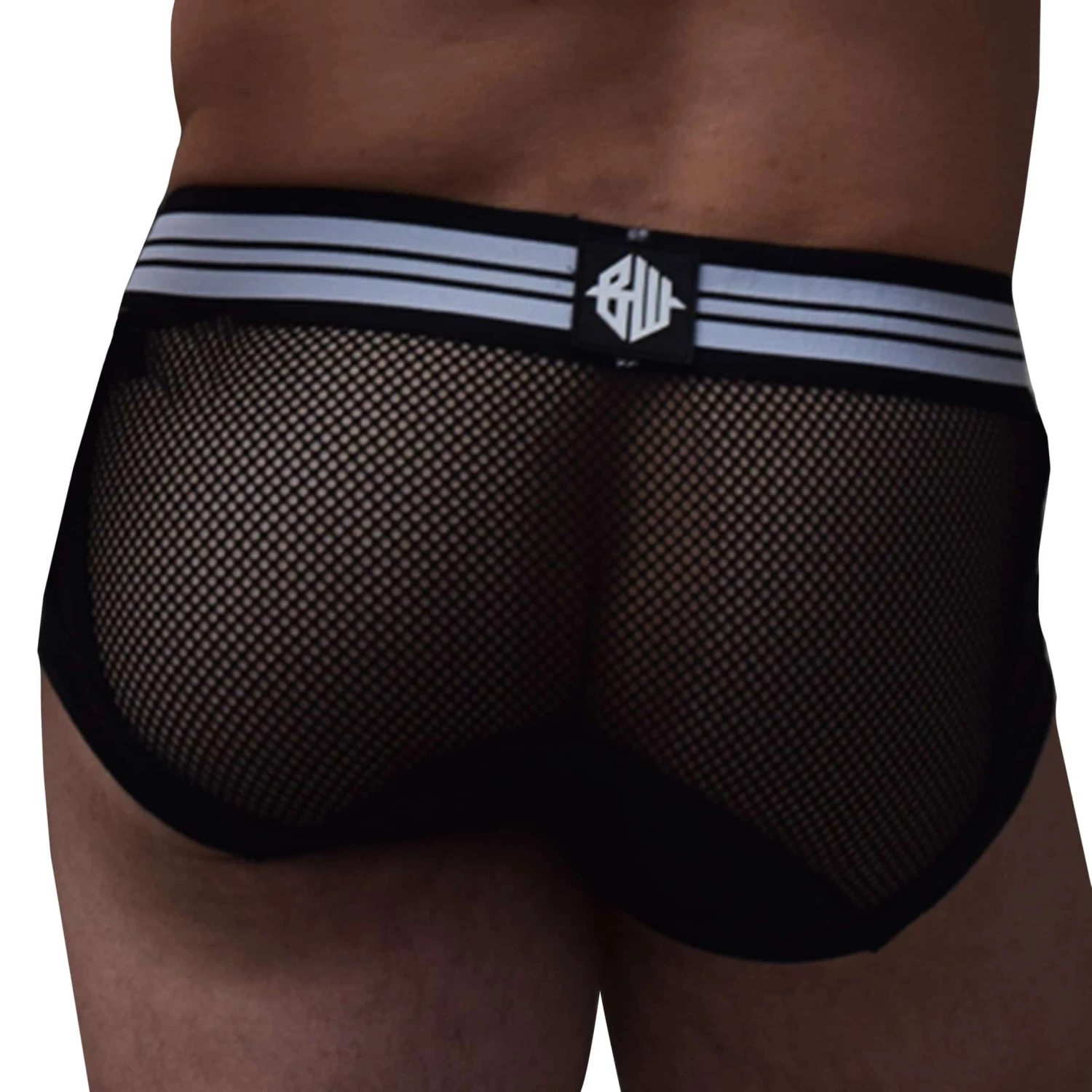 Slip sexy en microfibre extensible douce. Empiècements en résille transparente sur les côtés et les fesses. Poche frontale opaque non doublée. Ceinture élastique rayée avec patch Breedwell en PVC devant et derrière.