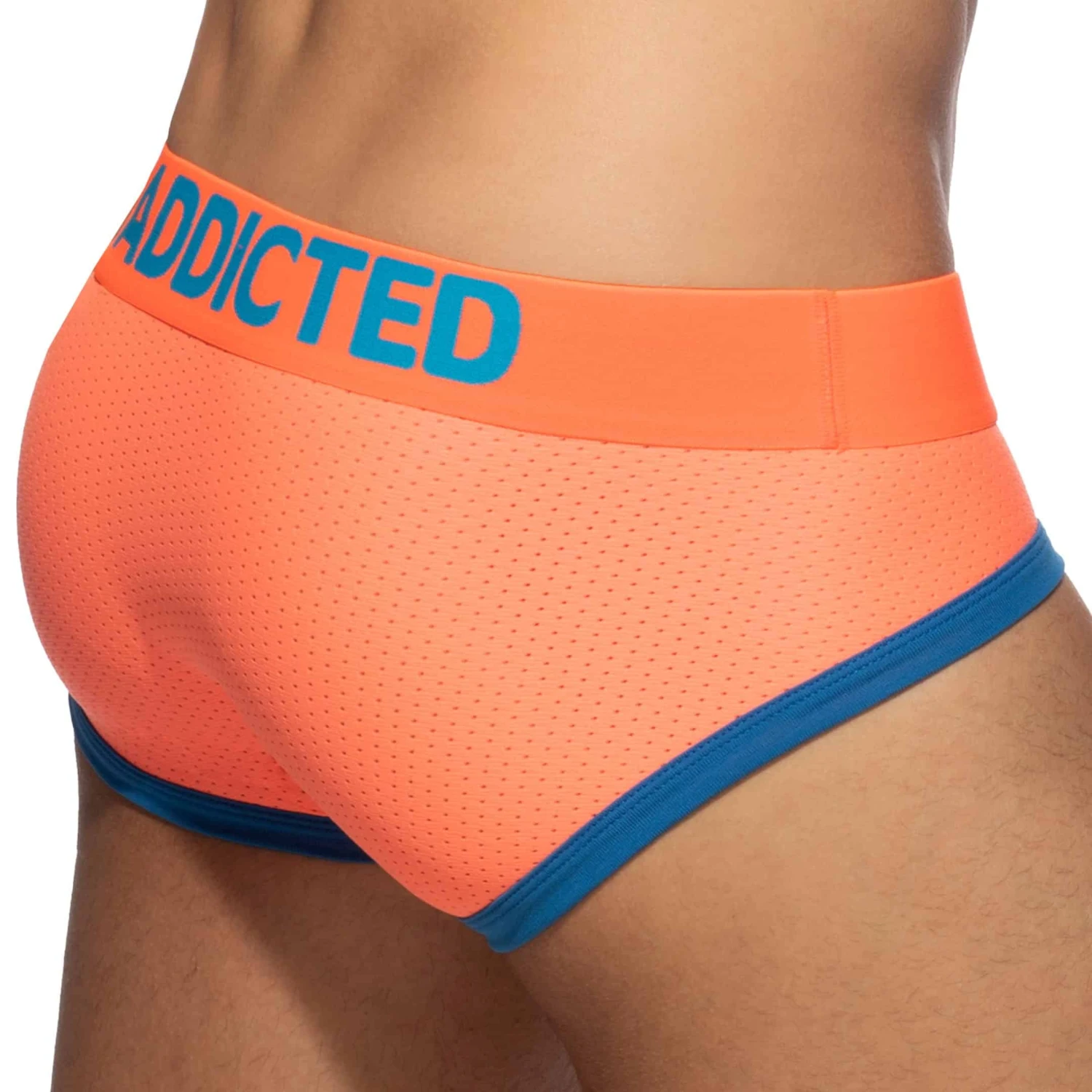 Slip taille basse très ajusté en mesh sport respirant et confortable de couleur fluo. Poche frontale non doublée. Bordures de couleur contrastée. Ceinture élastique signée Addicted. EXCLUSIVITE : coupe conçue par Les Dessous d’Apollon – Inderwear.