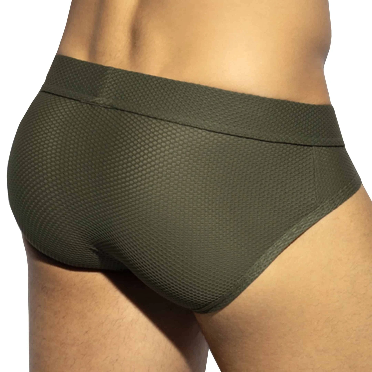 Slip en mesh extensible, incroyablement doux et confortable. Tissu en relief façon nid d’abeille. Poche frontale de grande capacité. Logo ES en silicone cousu la ceinture élastique recouverte.