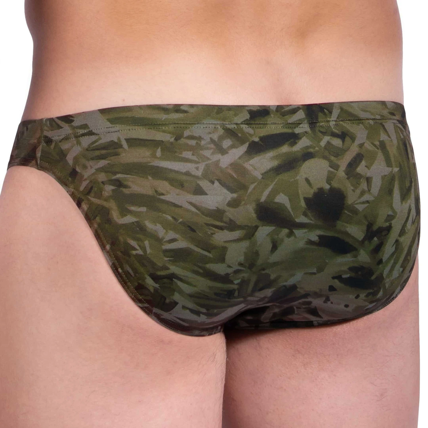 Slip taille basse en microfibre douce et ultra légère, pour une sensation exceptionnelle au contact de la peau. Imprimé digital constitué de feuilles en dégradé de couleur. Coupe simple et élégante. Poche frontale non doublée. Etiquette Olaf Benz sur la fine ceinture élastique recouverte.
