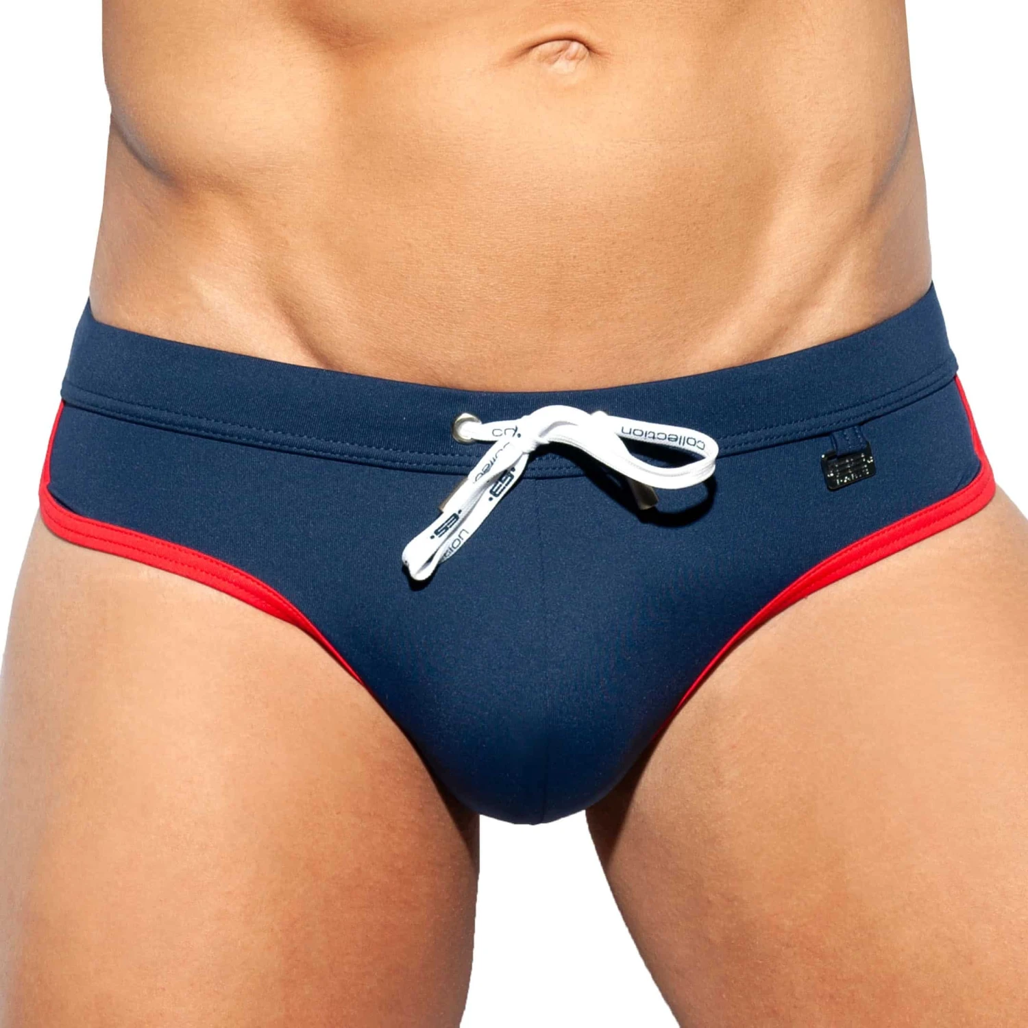 Slip de bain coloré aux formes originales. Coupe taille basse, échancrée et sexy, parfaitement ajustée. Modèle exclusif Les Dessous d’Apollon. Tissu très confortable et résistant. Système Pack Up amovible intégré. Plaque métallique ES Paris en Zamak inoxydable cousue sur le côté gauche de la ceinture. Cordon de serrage signé ES Collection.