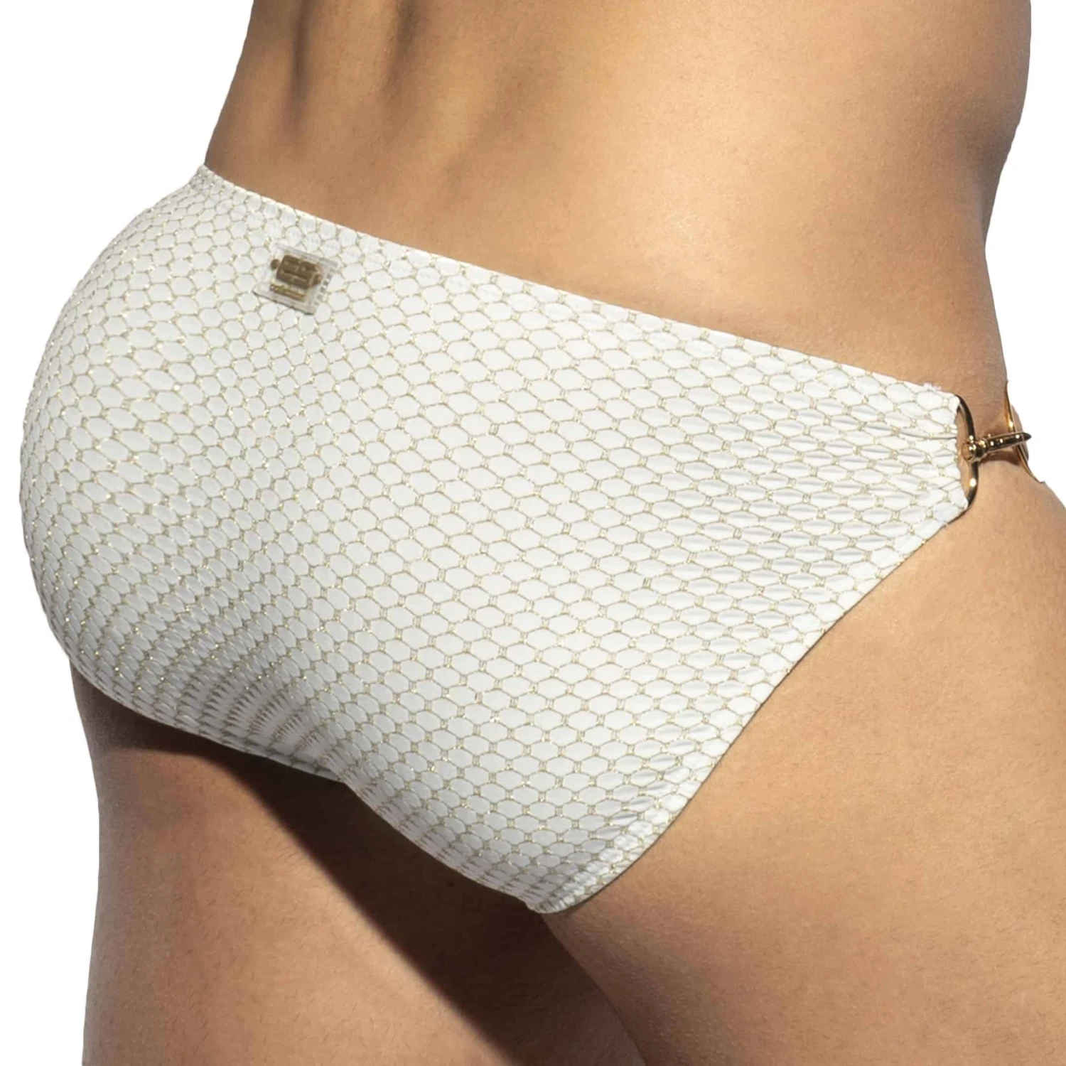 Slip de bain très luxueux en microfibre brodée de fils métallisés Lurex pour un effet cotte de maille. Coupe taille basse très ajustée. Crochets dorés sur les côtés. Poche frontale moulée sans couture pour un confort optimal. Système Pack Up intégré avec mousse amovible pour plus de volume frontal. Logo ES en silicone cousu au dos.