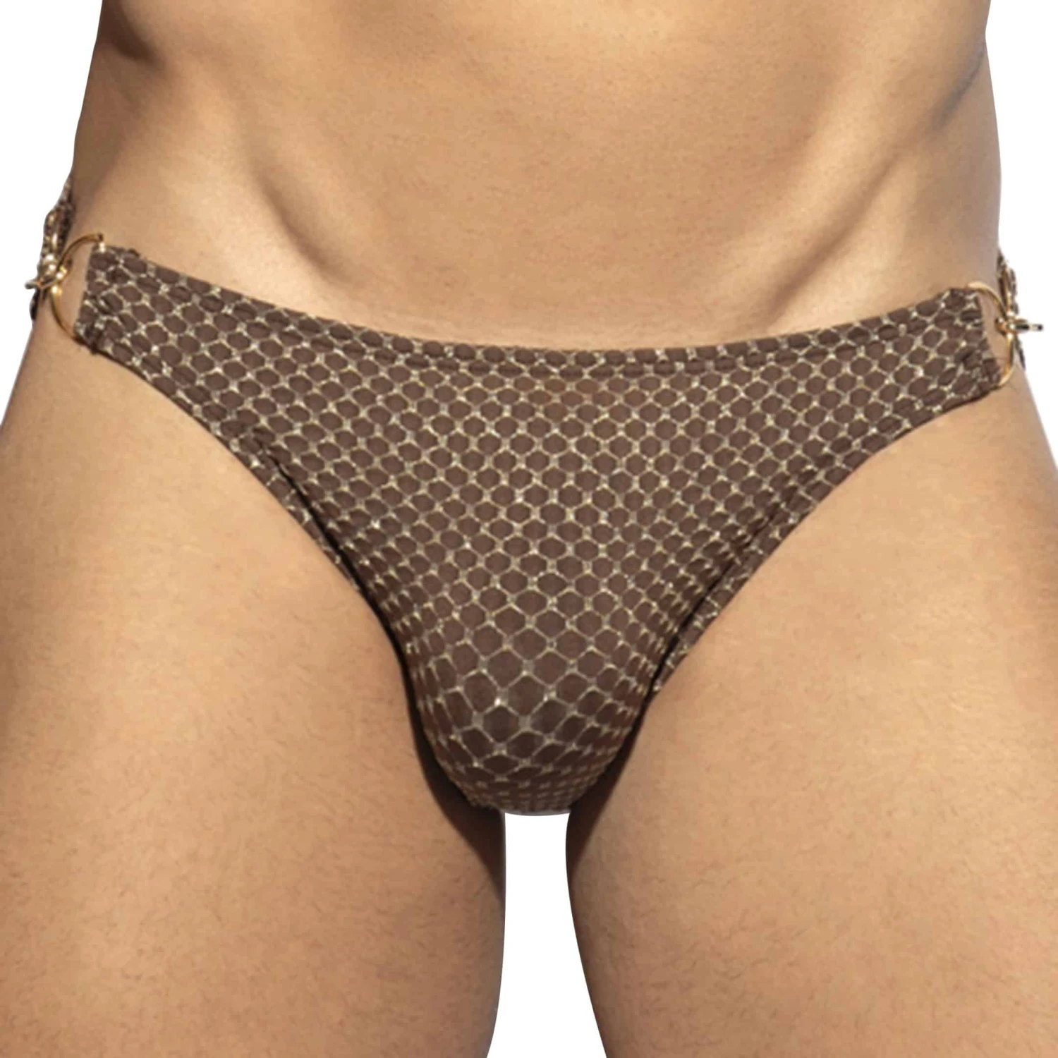 Slip de bain très luxueux en microfibre brodée de fils métallisés Lurex pour un effet cotte de maille. Coupe taille basse très ajustée. Crochets dorés sur les côtés. Poche frontale moulée sans couture pour un confort optimal. Système Pack Up intégré avec mousse amovible pour plus de volume frontal. Logo ES en silicone cousu au dos.