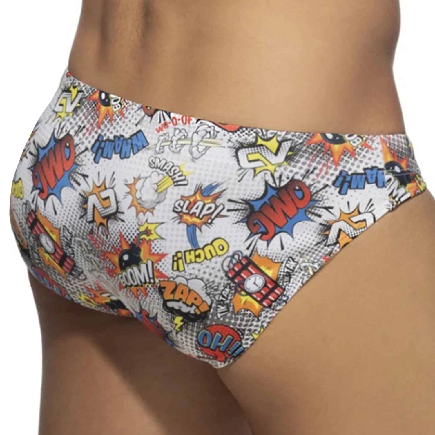 Slip de bain taille basse et sexy en microfibre imprimée d’un motif cartoon original et coloré. Système Pack Up intégré avec mousse amovible pour plus de volume frontal. Poche frontale moulée sans couture pour un confort optimal. Ceinture élastique avec cordon de serrage.