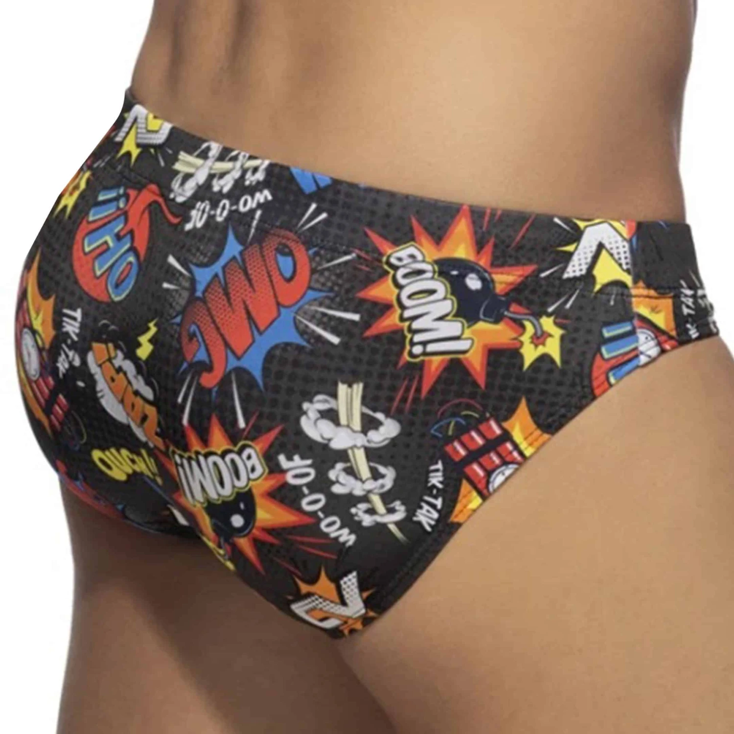 Slip de bain taille basse et sexy en microfibre imprimée d’un motif cartoon original et coloré. Système Pack Up intégré avec mousse amovible pour plus de volume frontal. Poche frontale moulée sans couture pour un confort optimal. Ceinture élastique avec cordon de serrage.
