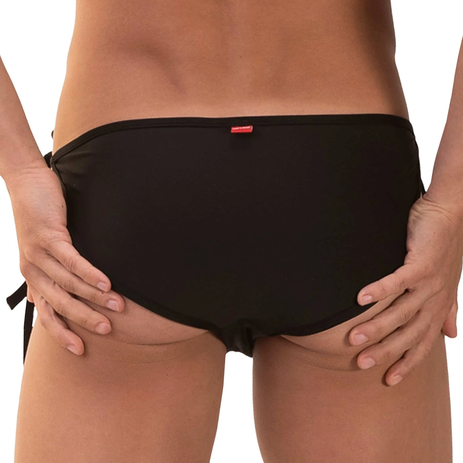 Slip de bain bikini sexy en microfibre extensible séchant rapidement. Cordon de chaque côté pour ajuster la taille. Poche frontale préformée non doublée.