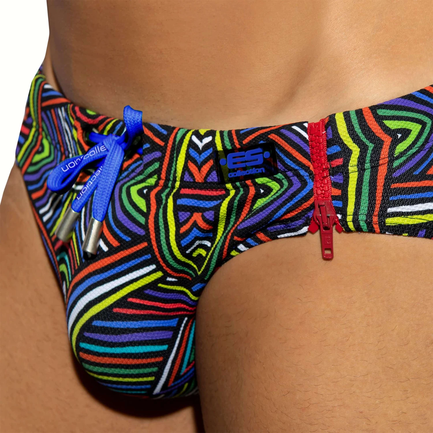 Slip de bain taille basse en microfibre piquée. Tissu Ecowave recyclé à partir de bouteilles en plastique. imprimé labyrinthe amusant et coloré. Design original avec fermeture éclair fonctionnelle de chaque côté. Système Pack Up intégré avec mousse amovible pour plus de volume frontal. Logo ES Collection en silicone sur la hanche gauche. Ceinture élastique avec cordon de serrage.