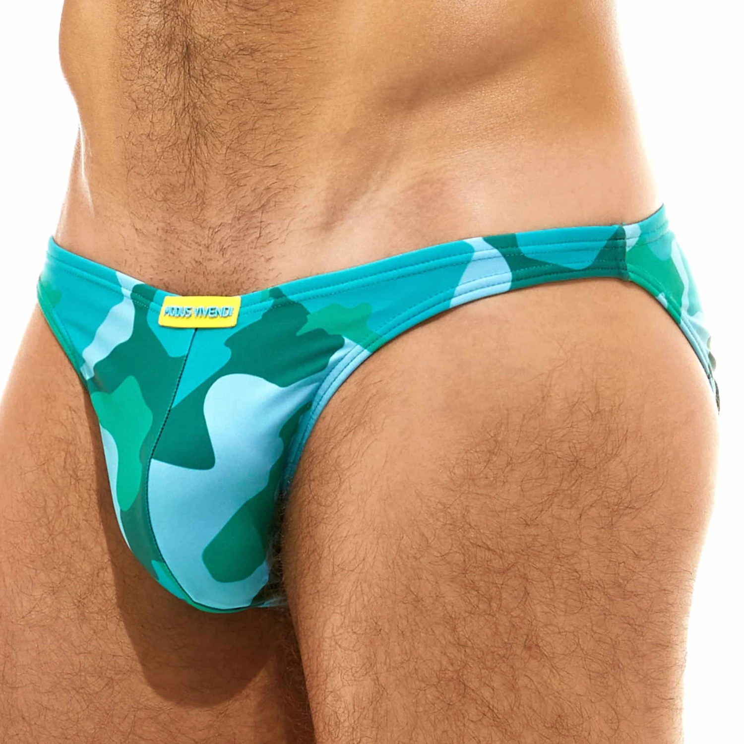 Slip de bain super taille basse en microfibre recyclée séchant rapidement. Imprimé camouflage. Coupe minimaliste, sexy et très ajustée. Poche frontale doublée. Ceinture élastique fine avec cordon de serrage intérieur.