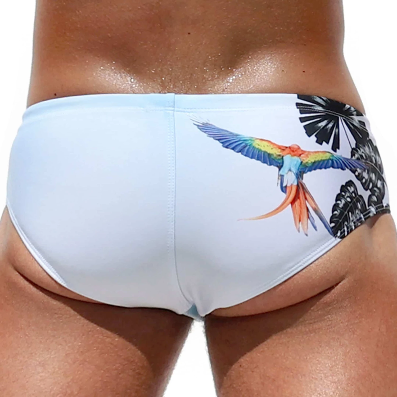 Slip de bain taille basse en microfibre séchant rapidement. Imprimé original combinant feuilles tropicales et perroquet en plein vol sur un fond dégradé bleu ciel. Cordon de serrage intérieur. Fabriqué en Californie.