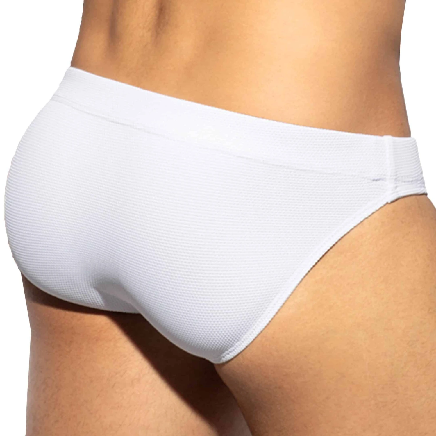 Slip de bain taille basse en microfibre piquée douce et légère de couleur intense. Système Pack Up intégré avec mousse amovible pour plus de volume frontal. Ceinture élastique avec cordon de serrage de couleur contrastée. Logo ES Collection en silicone sur la hanche gauche.