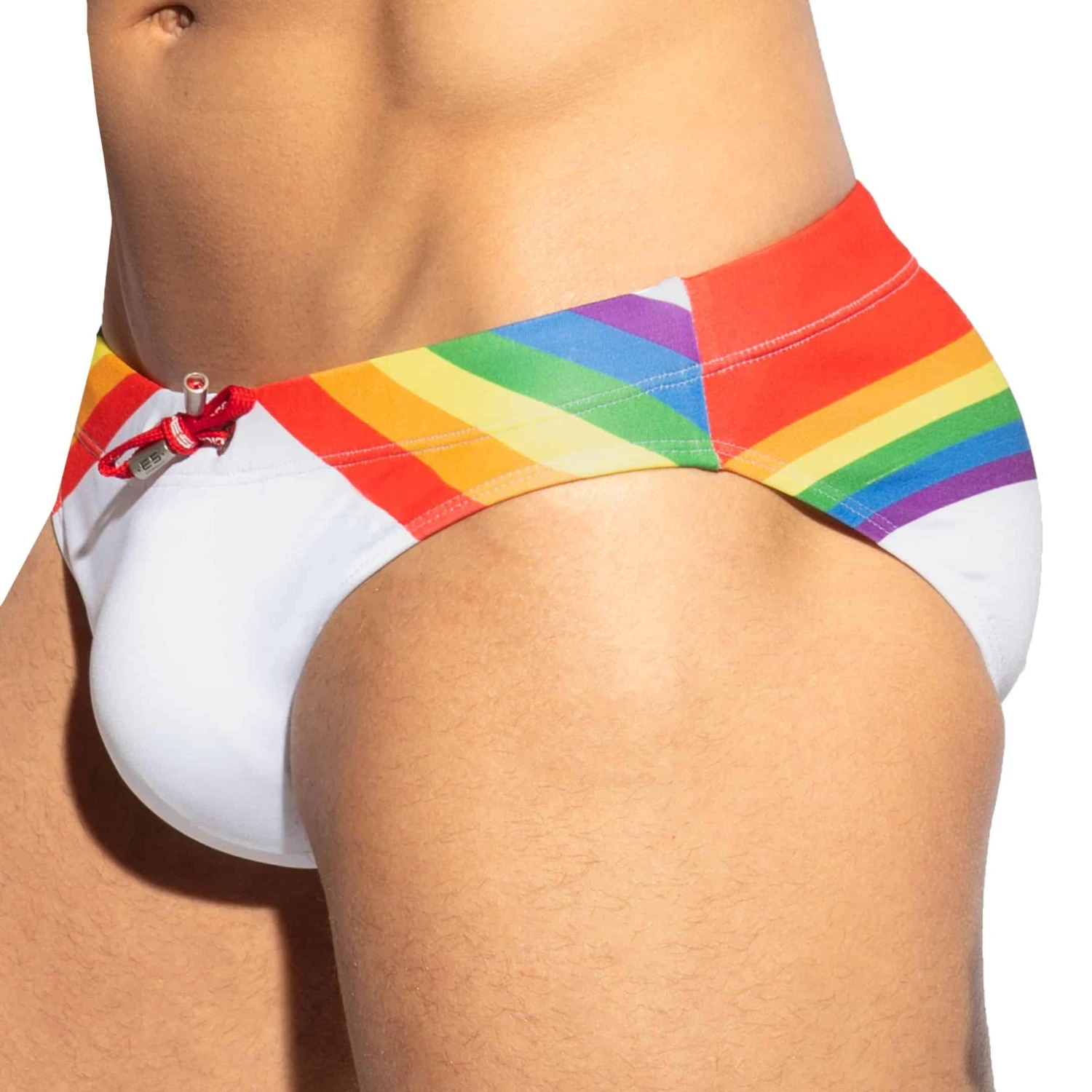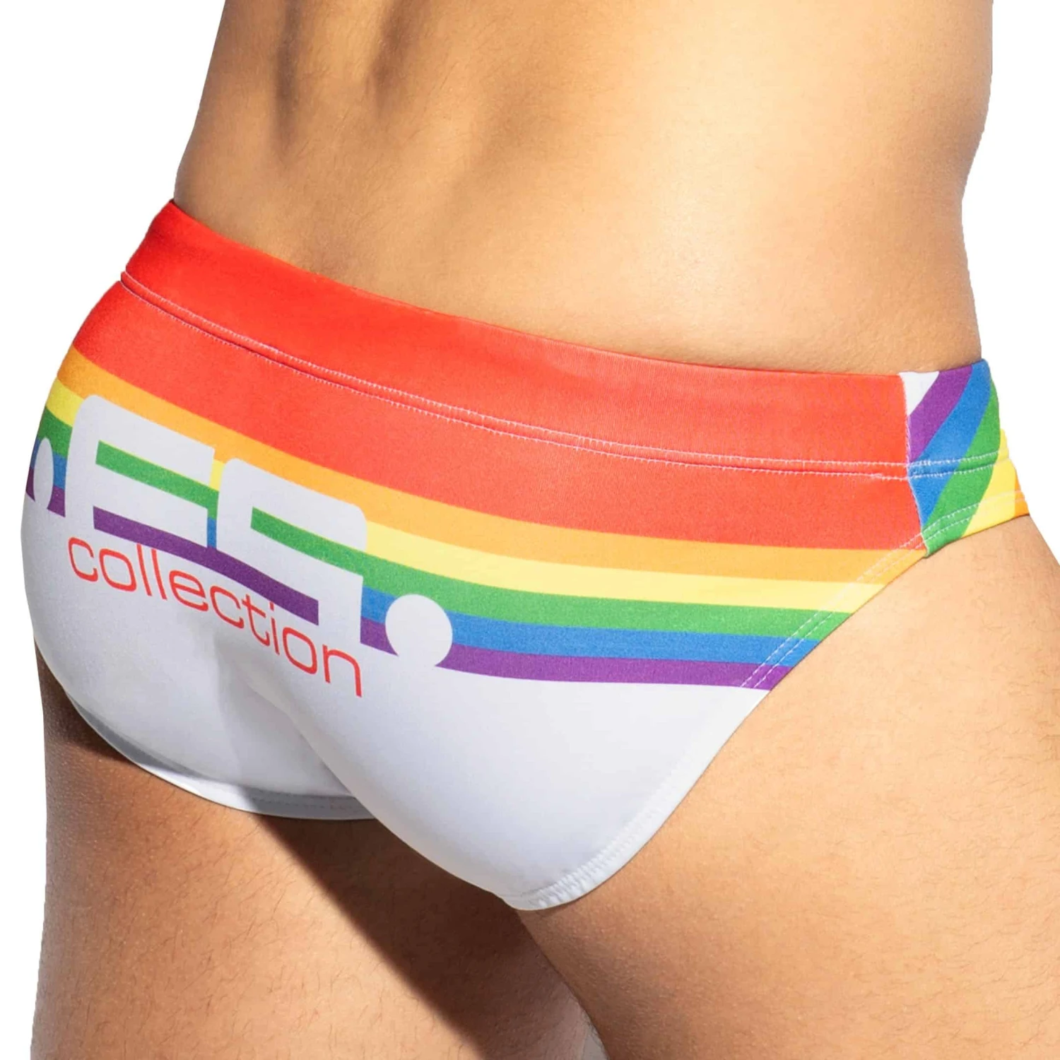 Slip de bain taille basse, sexy et ajusté. Rayures aux couleurs de l’arc-en-ciel. Logo ES imprimé sur les fesses. Système Pack Up avec mousse amovible pour mettre en avant votre masculinité. Ceinture élatique avec cordon de serrage.