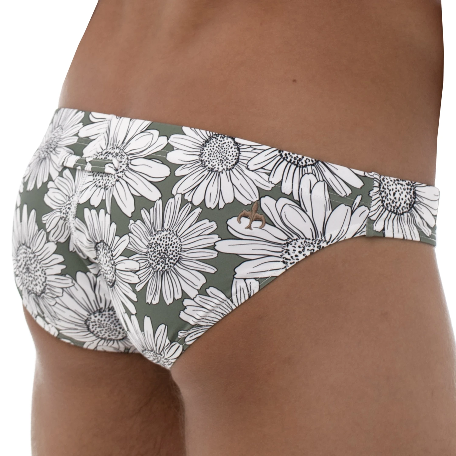 Slip de bain super taille basse en microfibre italienne extensible, douce et confortable. Imprimé floral. Poche frontale doublée et préformée. Ceinture élastique avec cordon de serrage intérieur. Logo Marcuse brodé au dos.