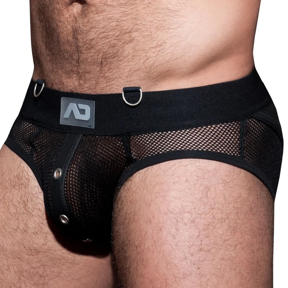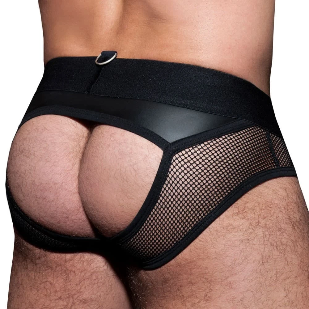 Slip en mesh transparent, dont le maillage large laisse peu de place à l’imagination. L’arrière a été découpée, comme sur un jockstrap, pour une totale liberté de mouvement. Empiècements en microfibre imitant le latex. Poche frontale non doublée. Large ceinture élastique dotée de 3 anneaux métalliques. Logo AD Fetish en silicone.