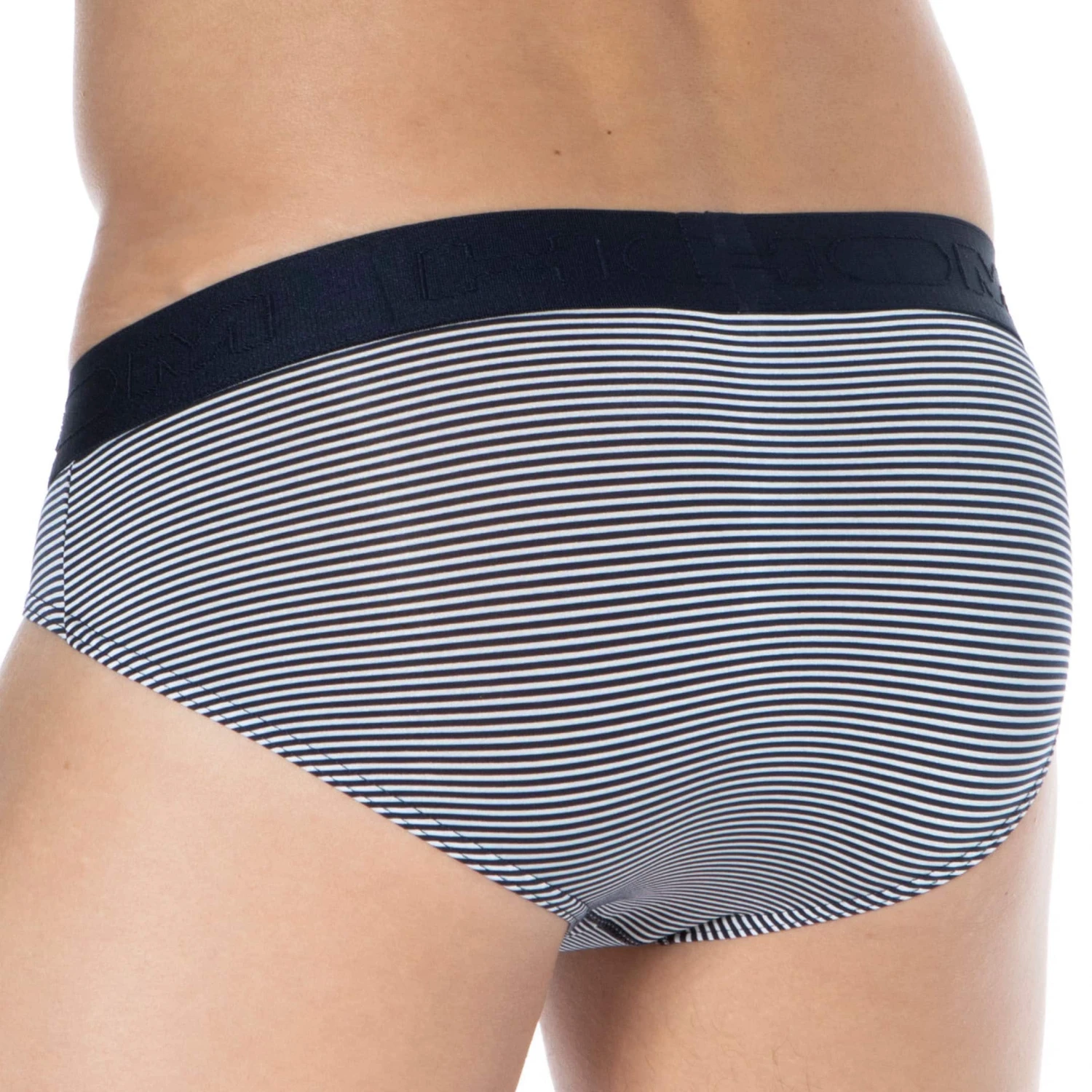 Slip en modal doux et soyeux. Rayure fine et élégante. Coupe classique assurant confort et maintien. Ouverture horizontale HO1 brevetée par HOM, aussi pratique pour les droitiers que les gauchers. Ceinture élastique HOM.