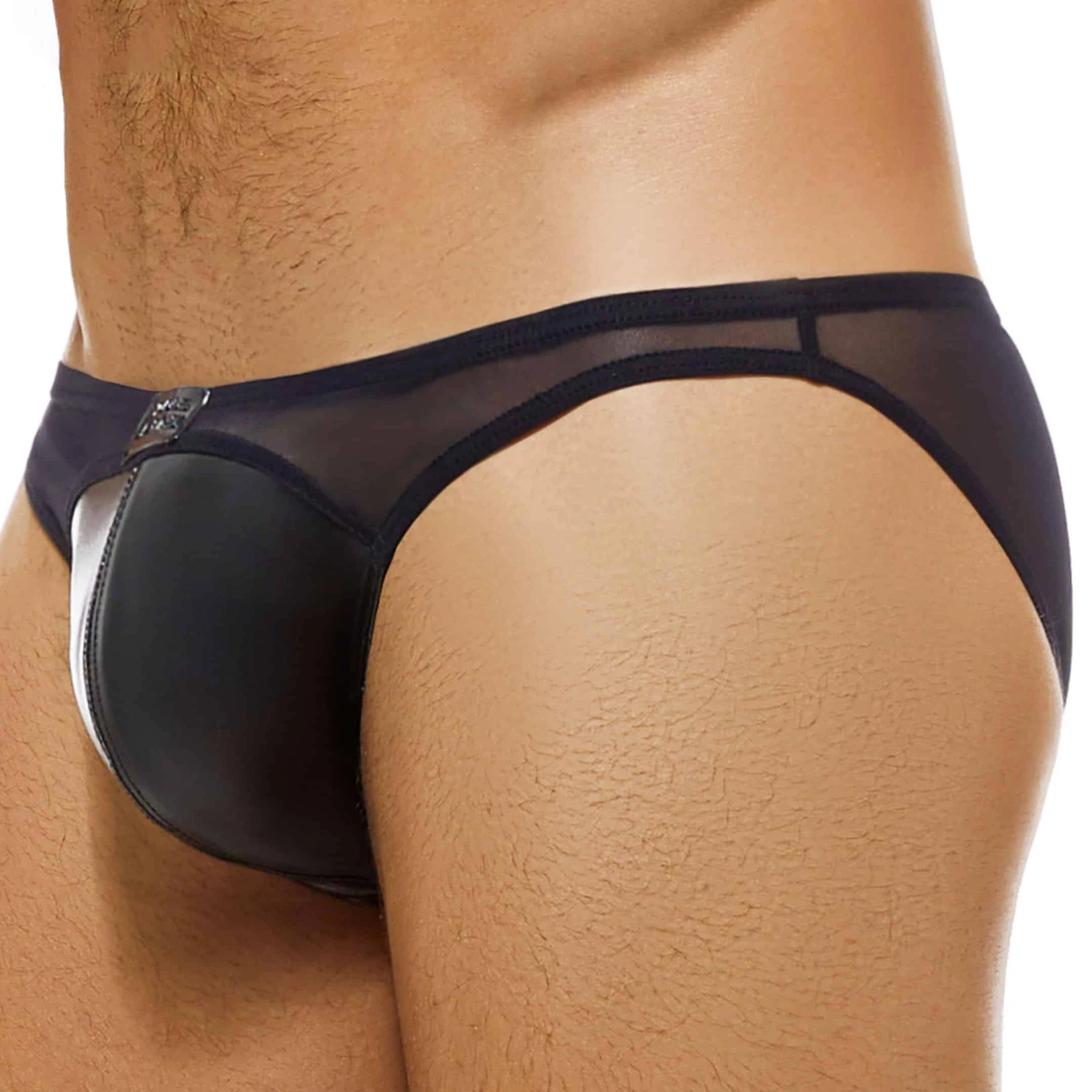 Slip ultra sexy en matière lisse et brillante imitant le latex. Voile transparent sur les parties latérales et arrière. Bande élastique au milieu des fesses pour un joli galbe. Coupe taille basse et minimaliste. Logo Modus Vivendi en silicone sur la ceinture élastique.