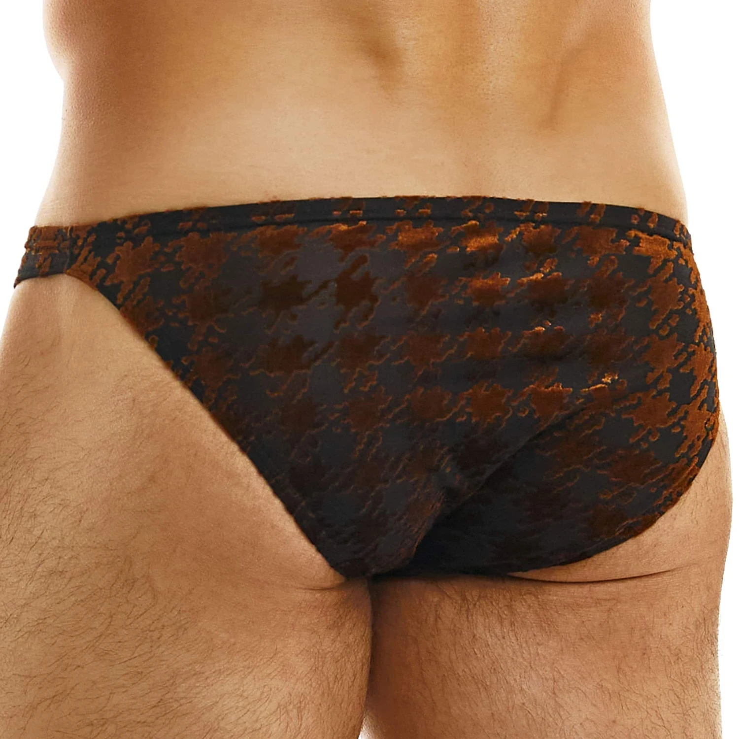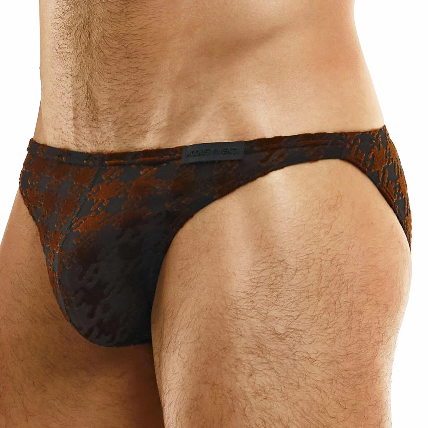Slip taille basse minimaliste et très luxueux en microfibre semi-transparente. Motif pied-de-poule en velours. Logo Modus Vivendi en silicone sur la fine ceinture élastique recouverte.