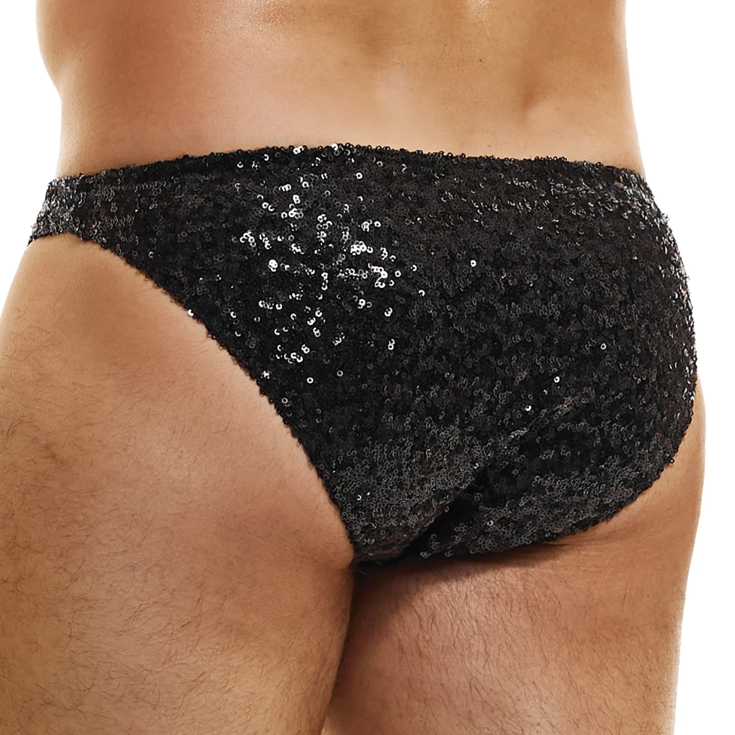 Slip mini taille basse en microfibre stretch semi-transparente recouverte de paillettes. Plaque métallique Modus Vivendi sur fine ceinture élastique recouverte.