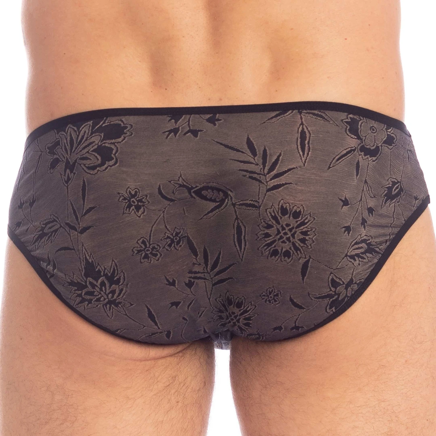 Slip chic et romantique en microfibre douce, légère et confortable. Tissu légèrement transparent avec un motif floral noir. Coupe minimaliste super taille basse. Poche frontale non doublée. Fine ceinture élastique recouverte.
