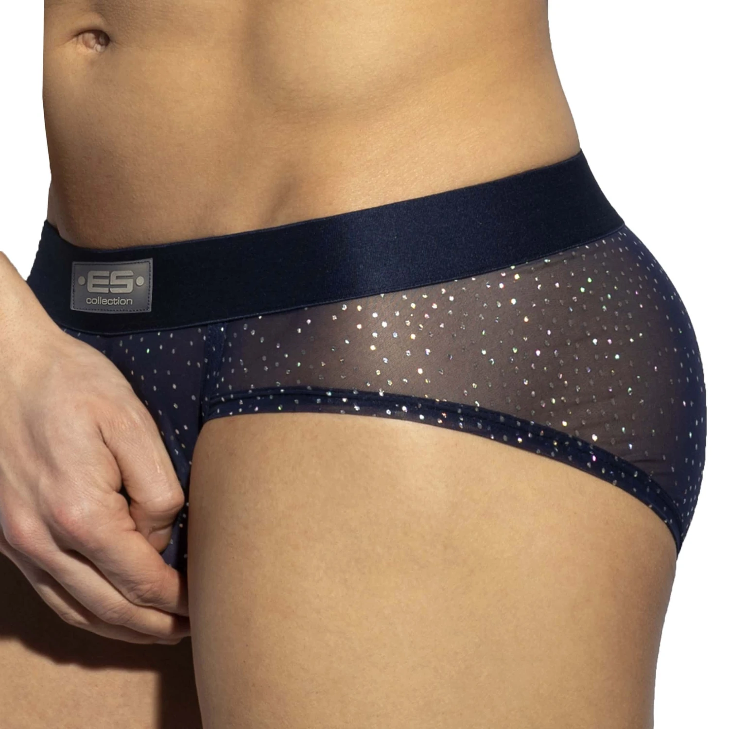Slip taille basse très ajusté en voile recouvert de paillettes. Tissu fin, extensible et transparent. Belle poche frontale non doublée. Ceinture élastique avec étiquette ES Collection en silicone.