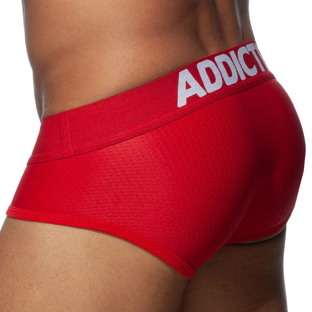 Slip de couleur unie en mesh respirant, léger et confortable. Poche frontale push up extra-large pour un excellent maintien et une valorisation naturelle de votre masculinité. Ceinture élastique signée Addicted.