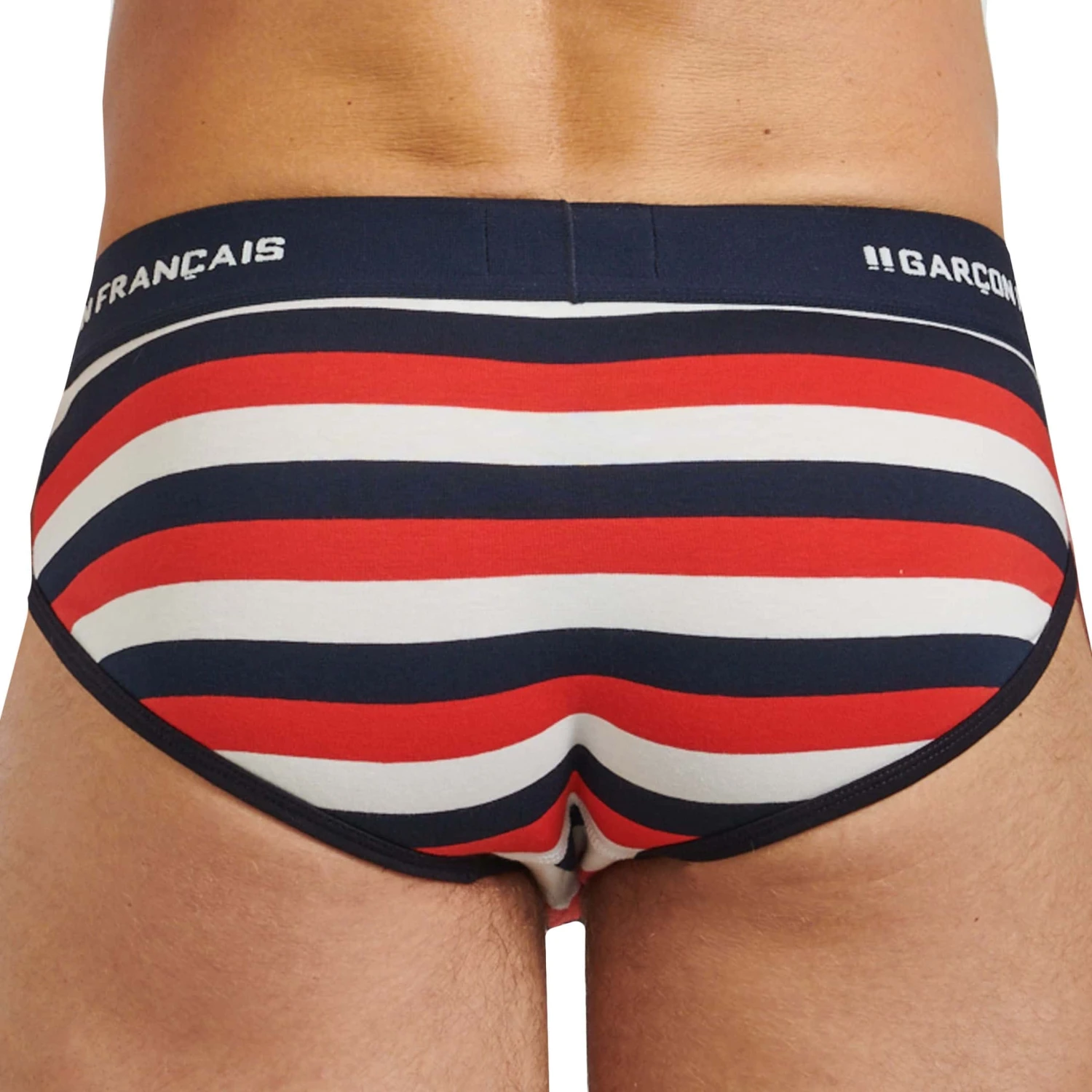 Slip taille basse très ajusté en coton doux, souple et confortable. Rayures avec grande qualité de finition. Nouvelle version avec une poche plus ergonomique et un arrière enveloppant mieux les fesses. Belle ceinture Garçon Français. Fabrication 100% française.