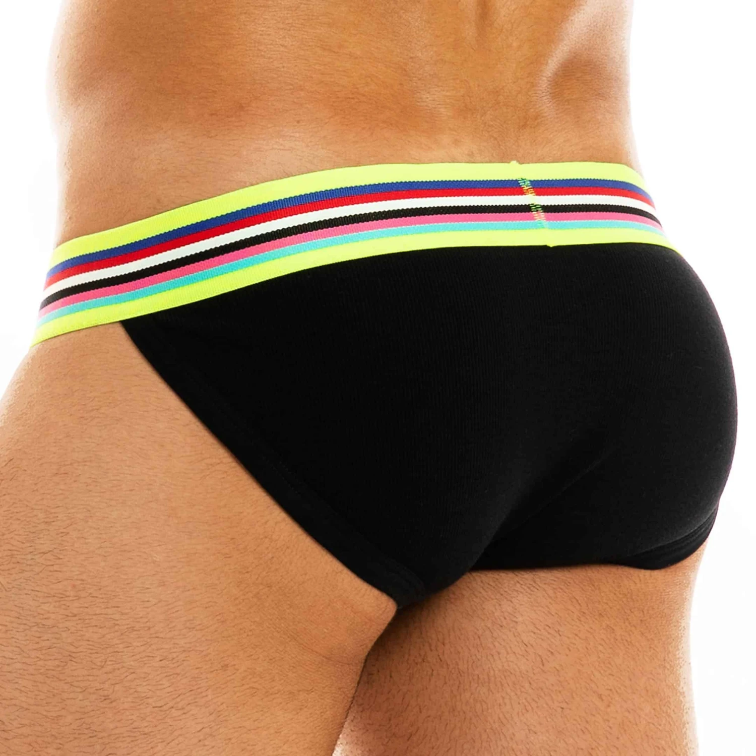 Slip taille basse en coton côtelé, doux et confortable, de couleur intense. Coupe tanga très sexy. Ceinture élastique rayée aux couleurs de l’arc-en-ciel.