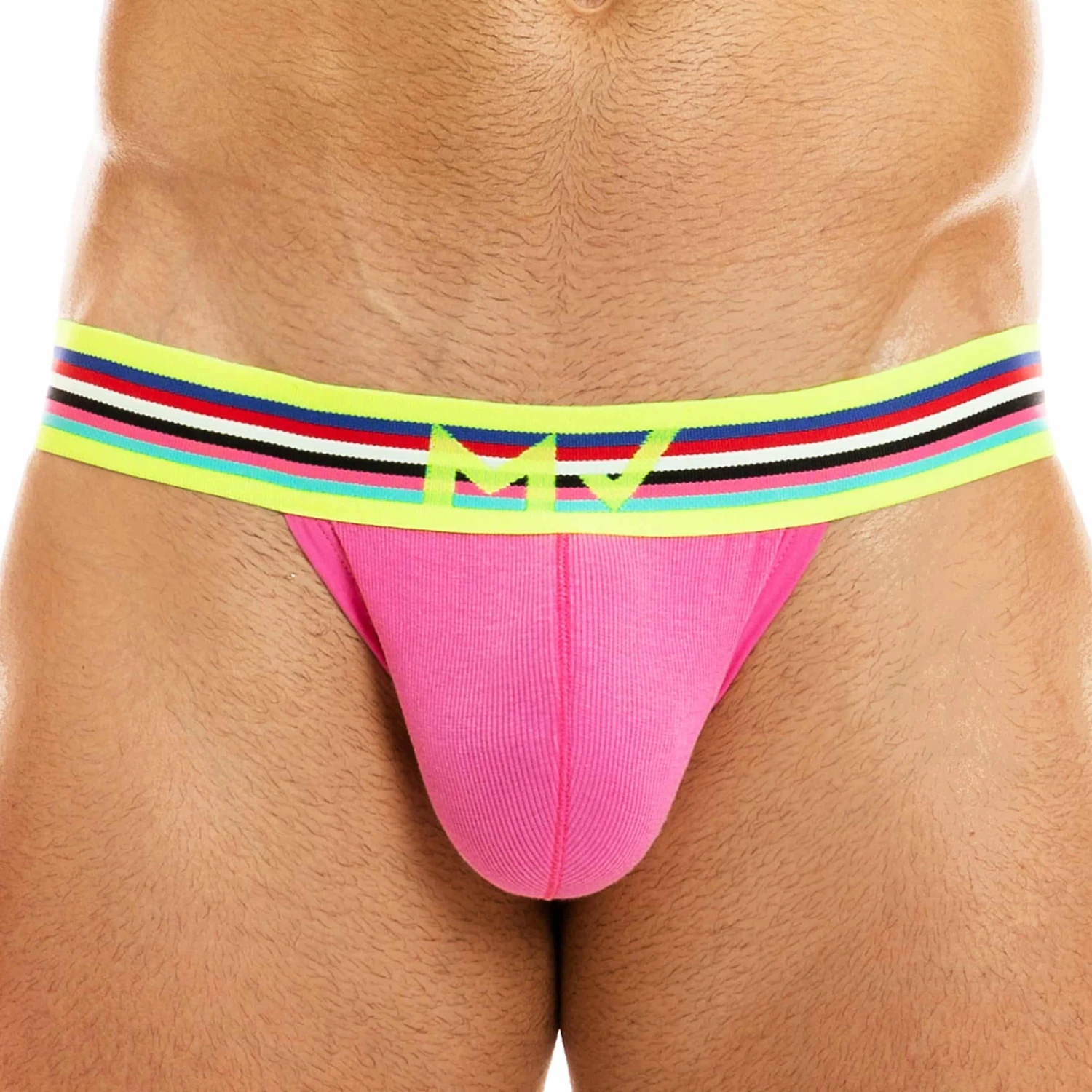 Slip taille basse en coton côtelé, doux et confortable, de couleur intense. Coupe tanga très sexy. Ceinture élastique rayée aux couleurs de l’arc-en-ciel.