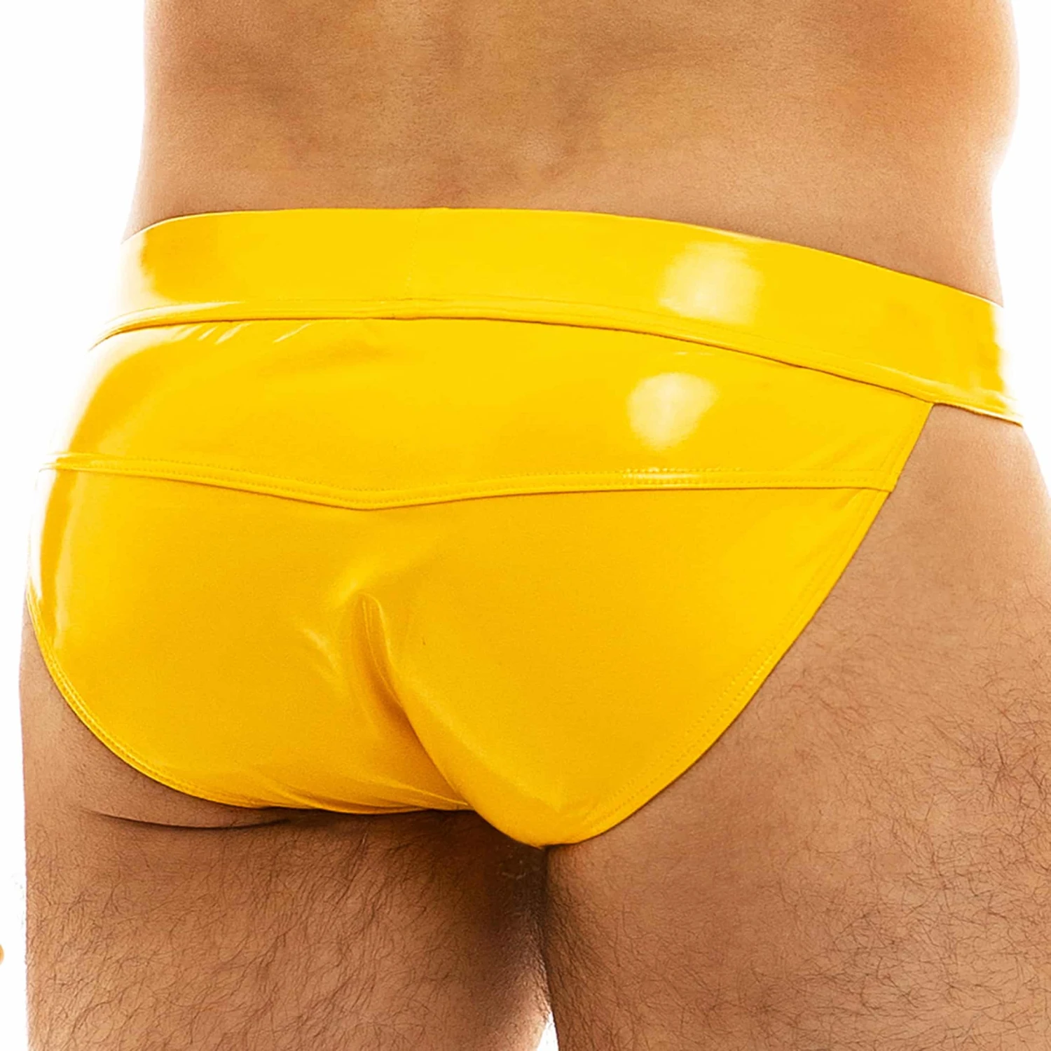 Slip tanga très sexy en vinyle brillant pour un look fetish. Ceinture élastique recouverte signée MV en relief.