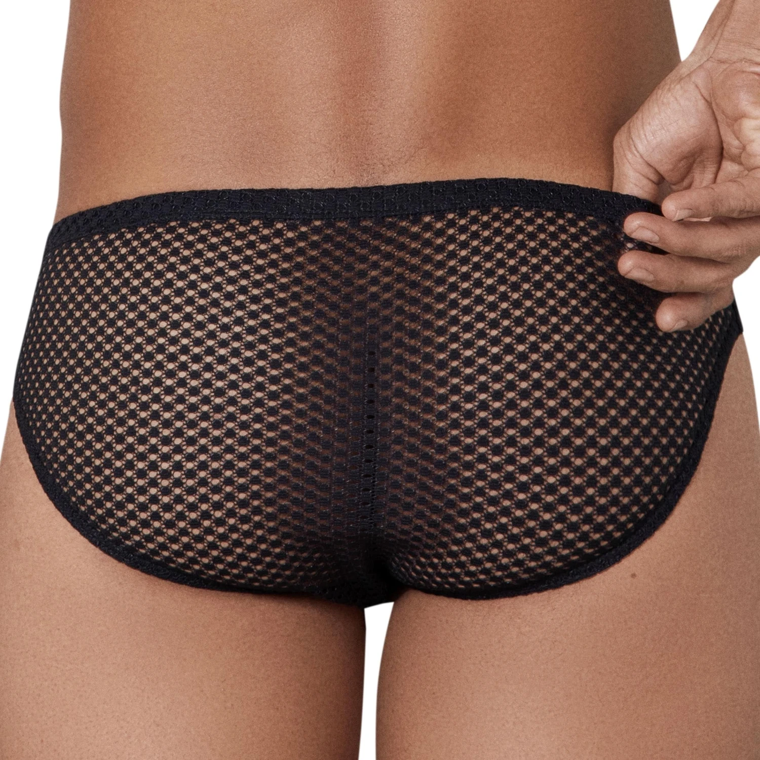 Slip sexy en microfibre extensible, douce et confortable. Empiècement en résille transparente sur les fesses. Poche frontale ergonomique non doublée. Fine ceinture élastique recouverte.