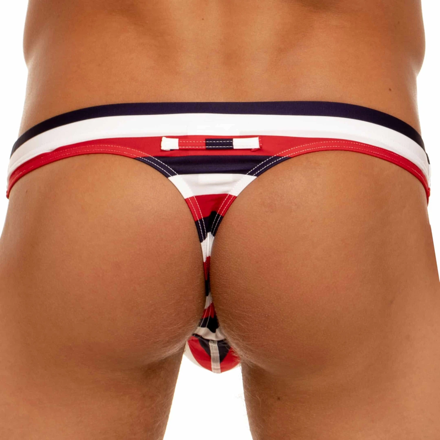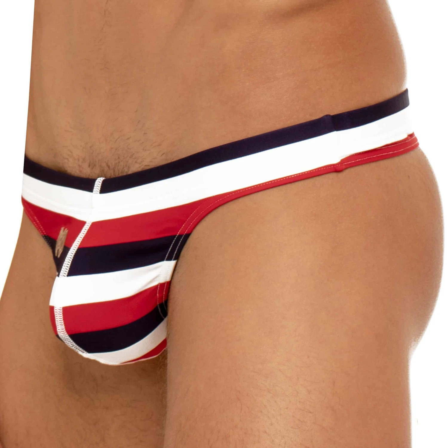 String de bain très sexy en microfibre italienne, extensible et résistante. Rayure nautique très stylée. Coupe super taille basse très ajustée. Poche frontale 3D doublée. Logo brodé. Ceinture élastique avec cordon de serrage intérieur.